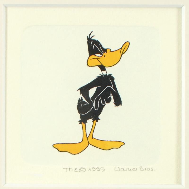 "Daffy Duck (Looking to the Side)" is a limited edition etching on paper with hand-tinted coloring from Warner Bros, numbered and dated 1999. This piece comes framed. Measures approx. 9" x 9" (with frame), 1.5" x 2.5" (image).