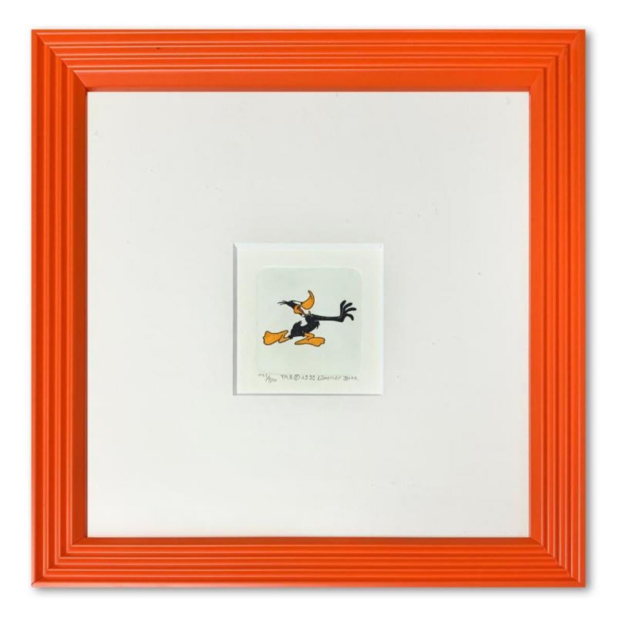 Daffy Duck by Looney Tunes. "Daffy Duck" is a limited edition etching on paper with hand-tinted coloring from Warner Bros, numbered and dated 1999. This piece comes framed. Measures approximately 9" x 9" (with frame), 2" x 2" (image).