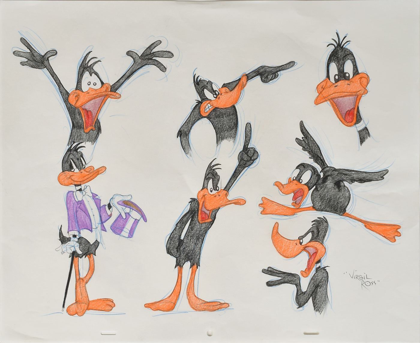 (Warner Brothers Studios, circa 1990s) Original color model drawing by Virgil Ross featuring Daffy Duck in seven different poses, signed below in pencil by Ross. Accomplished in graphite and colored pencil on untrimmed 16.5 x 13.5 animation paper, with the total image measuring 14 x 11.5. In fine condition.