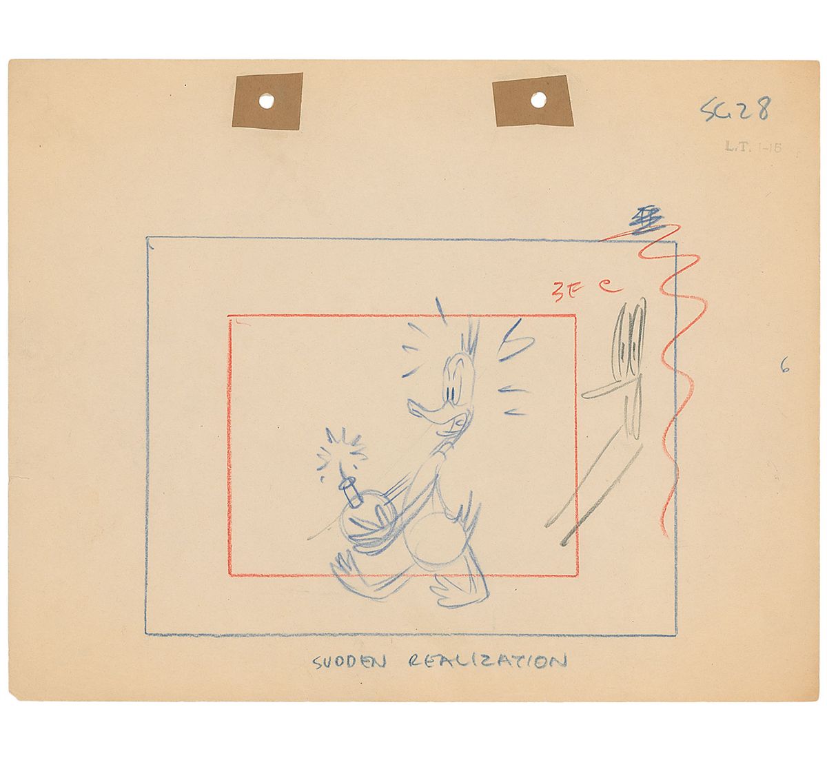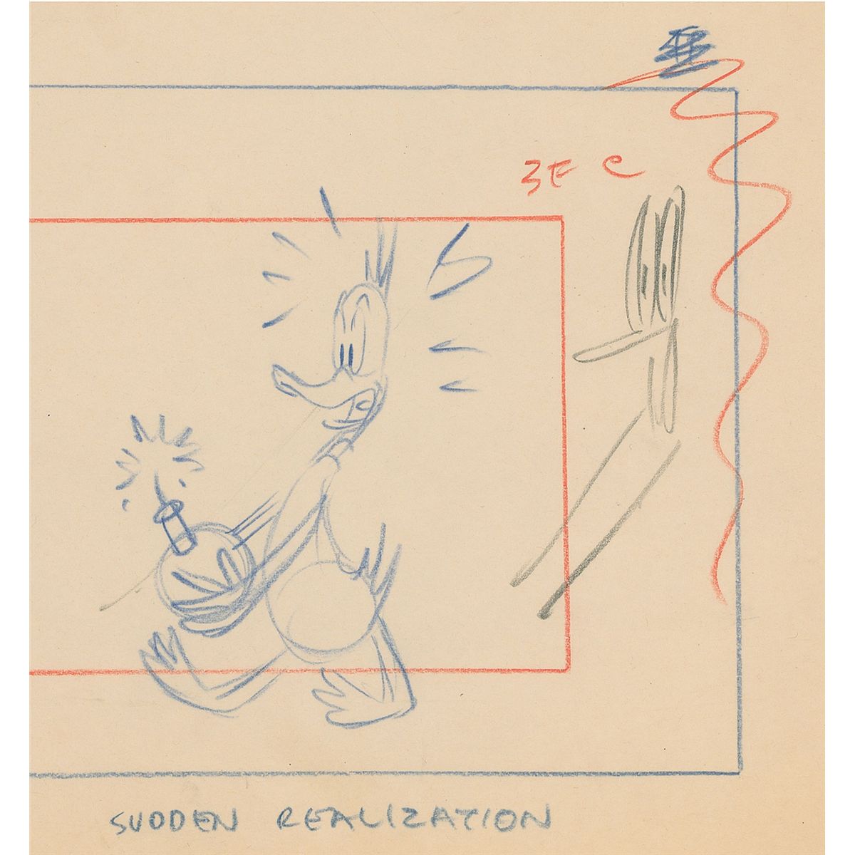 (Warner Brothers Studios, Circa 1940s) Original production layout drawing featuring Daffy Duck from a 1940s cartoon. Accomplished in graphite on untrimmed 12 x 9.5 animation paper. Image of Daffy realizing he is carrying a lit bomb measures 2.5 x 4.75, with a small portion of a rough sketch of his face to the right of the image, and animator’s notation reading “Sudden realization,” along the bottom. In fine condition, with a mild shade of toning.