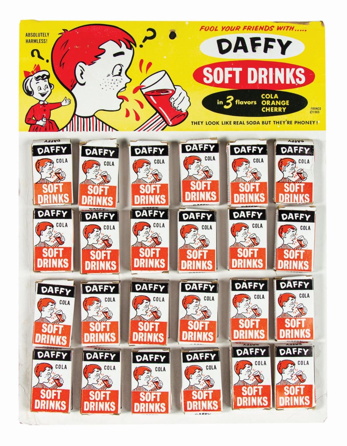 (Franco, 1965) A store display for Daffy Soft Drinks prank cola containing (24) unused packs. The joke sodas come in cola, orange, and cherry, and the display declares that "They Look Like Real Soda But They're Phoney!" but also assures that it is "Absolutely Harmless!" Measuring 15"x11.5", the display is in good condition with some edge-wear and bending at the corners. A few of the display boxes show signs of crushing.