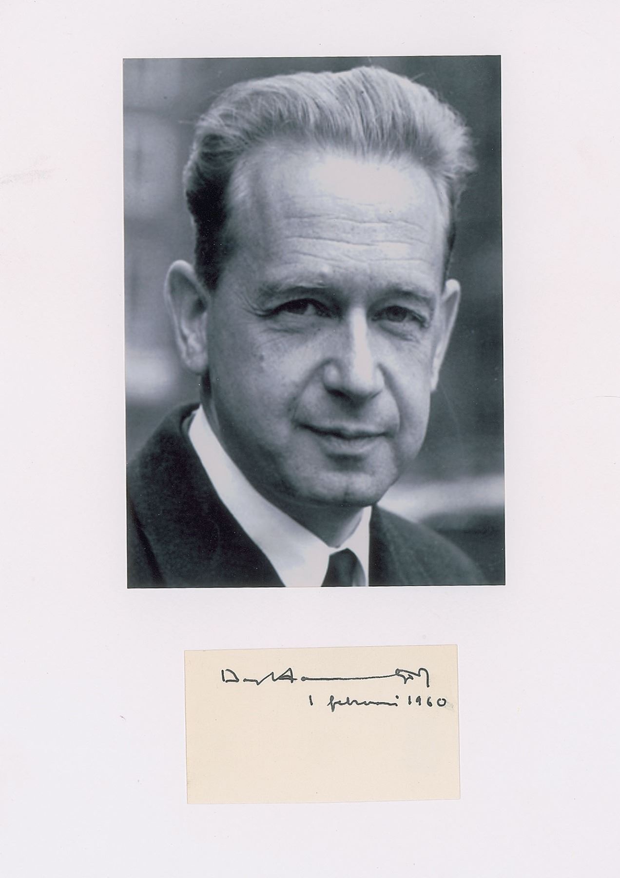 Vintage ink signature, "Dag Hammarskjöld, 1 Februari 1960,” on an off-white 3.5 x 2 card, which is affixed to a white 8.25 x 11.75 mount bearing an attached portrait. In fine condition.