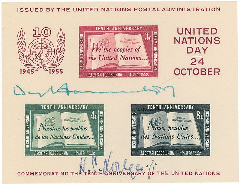United Nations Secretary General from 1953 to 1961. Philatelic souvenir, 4.25 x 3.25, commemorating the 10th anniversary of the United Nations, signed in green ink by Hammarskjold, and also signed in blue ink by Henry Cabot Lodge, Jr. In fine condition. Accompanied by a TLS from 1956 acknowledging the signatures.