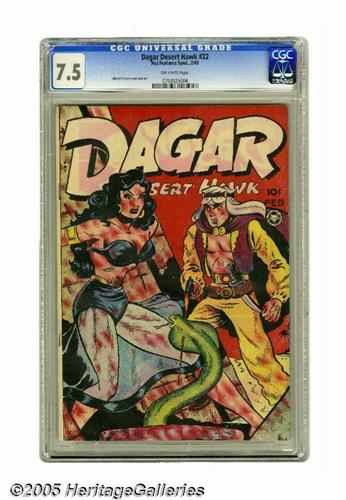 <B>Dagar, Desert Hawk #22 (Fox Features Syndicate, 1949) CGC VF- 7.5 Off-white pages.</B></I> Edmond Good cover and art. Note that the CGC slab has a small (3/4 inch) crack at the top rear. Overstreet 2005 VF 8.0 value = $241. CGC census 6/05: 3 in 7.5, none higher.