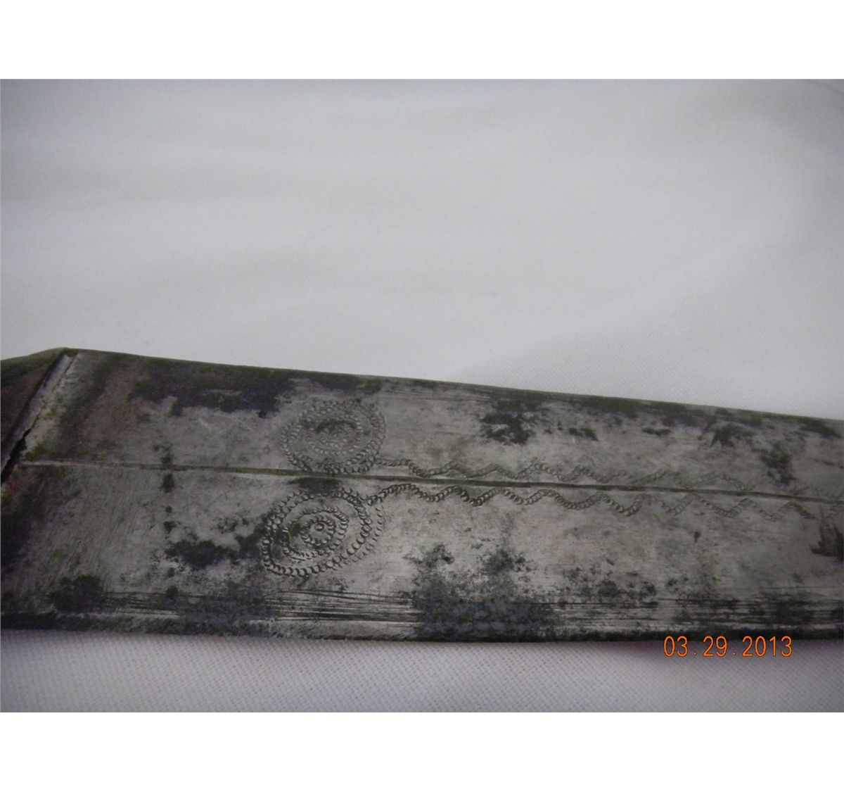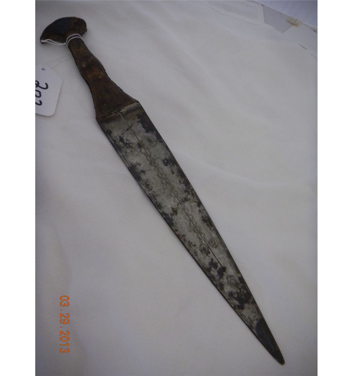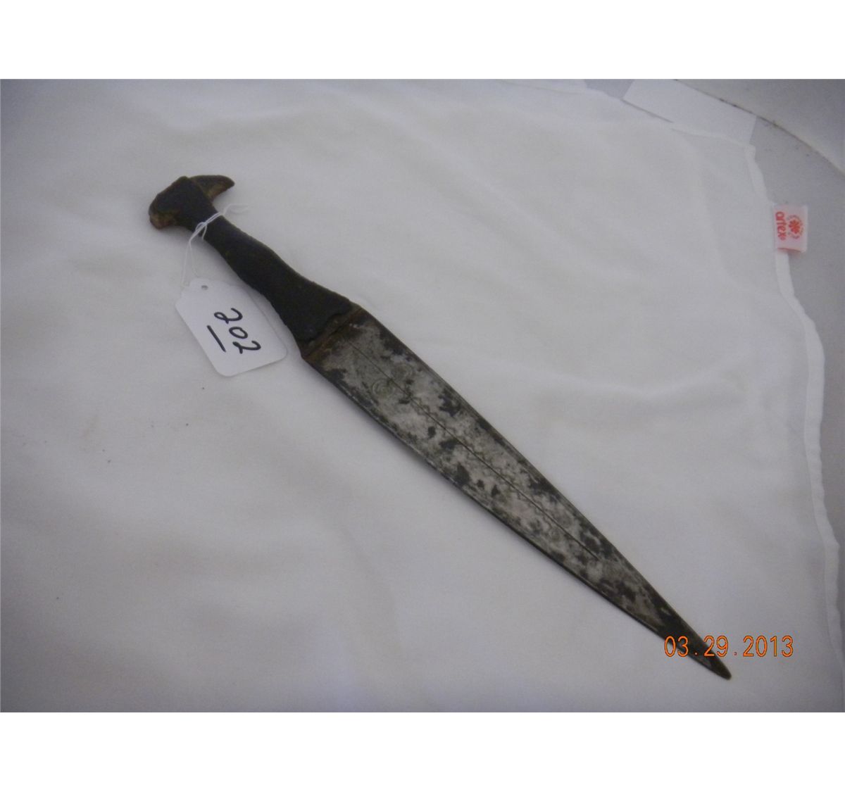 Dagger from Bagdad with wood handle, steel blade, measuring approximately 16"x2", About 200 years old. Leather is damaged and steel blade is rusty also chip on one corner of the wood handle Shipping $20.00