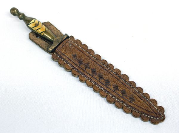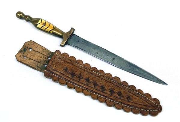 Dagger With Leather Sheath. Blade etched, ''Marca Ruyal, Leon Guanauato-Cmirtha por un amore''. Translation is the ''Royal Mark, Leon Guanauato Mexico, ladies name Cmirtha, for a love.'' Older piece.