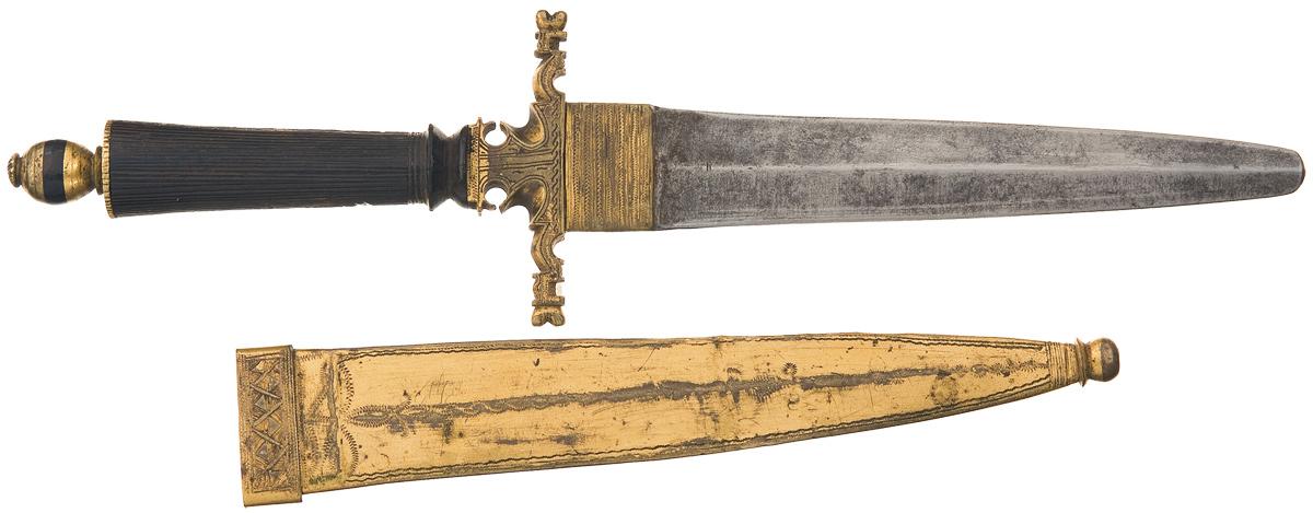 Double edged blade, 5 3/8" long, with a rounded tip and a zig-zag engraved gold finished brass blade wrapped around the ricasso. Dual quillion guard, with cutout accents and zig zag engraving, one piece rosewood grip with ribbed sides, and a flat pommel with a round nut and a rosewood accent band. OAL: 9 1/4". Gold washed sheath, with zig-zag engraving, round tip and a hanging ring on the throat.