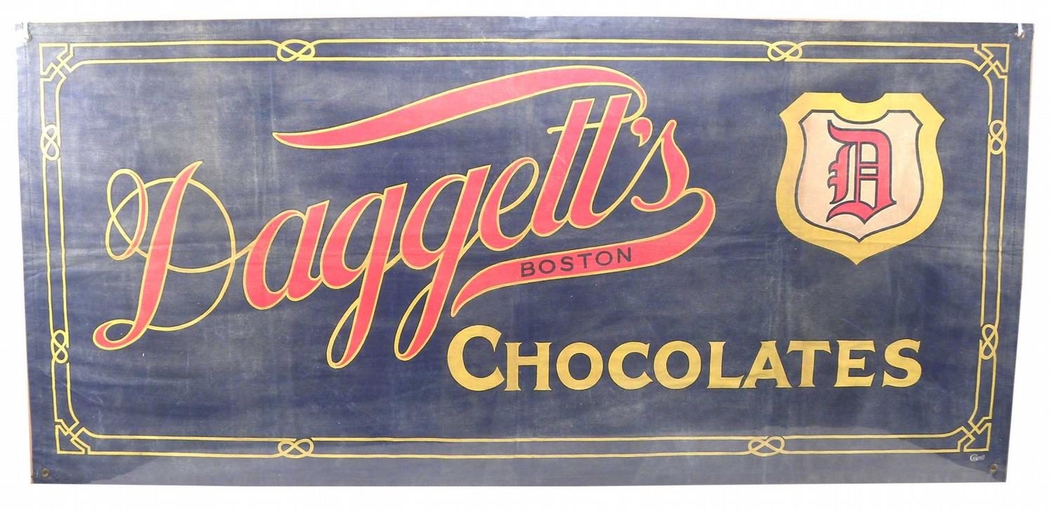 Daggett's Chocolates, Boston Canvas Banner. Metal grommets in all four corners. Some fading to the back ground otherwise very good condition. 58 X 27 inches.