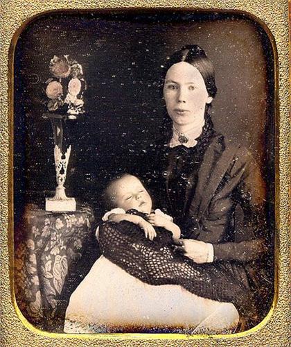 How do we know the baby is deceased and not sleeping? The floral arrangement is a clue. The young mother has a "resigned" expression; that is one of the most interesting aspects of the image. The baby, who has inherited her mother's face, has neither a feeling of rest nor of animation. This empty sadness gives this an expressive character that draws our interest beyond numerous more bland "post mortems." In a flawless geometric thermoplastic case, Berg. 3 - 104. In paper seals that have been there for quite a while. [3+]