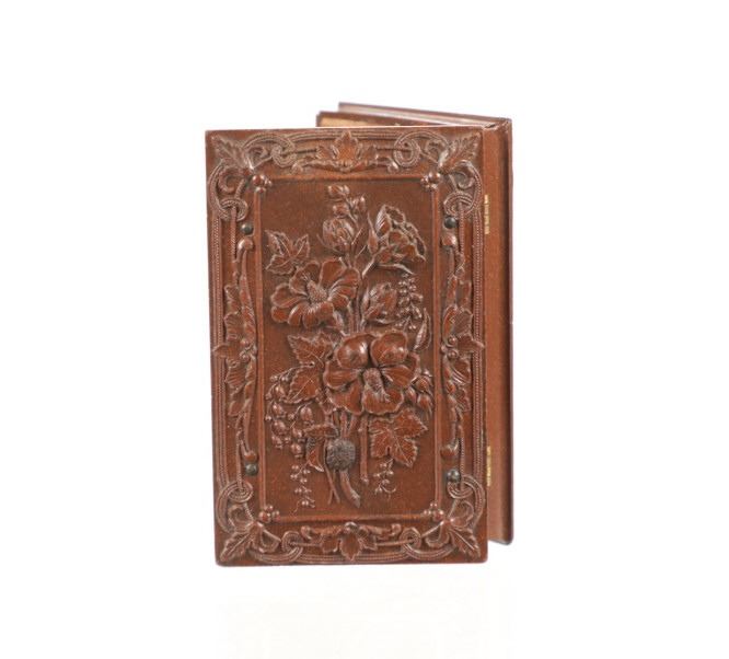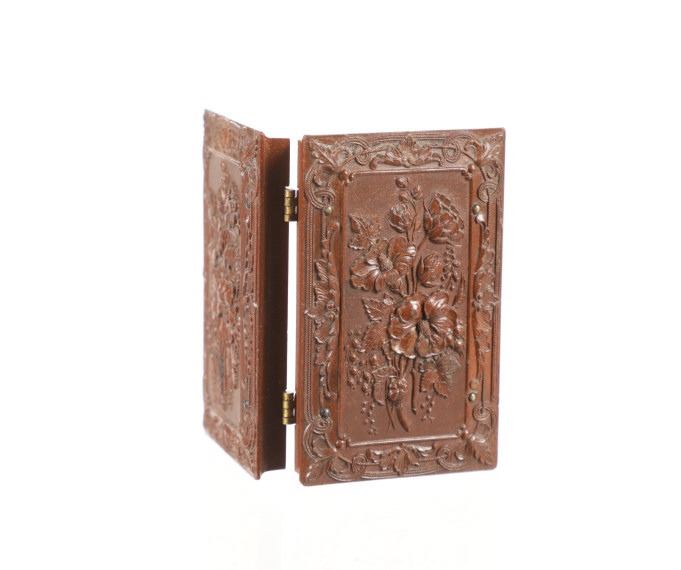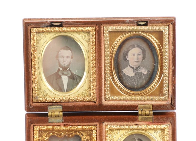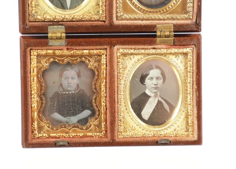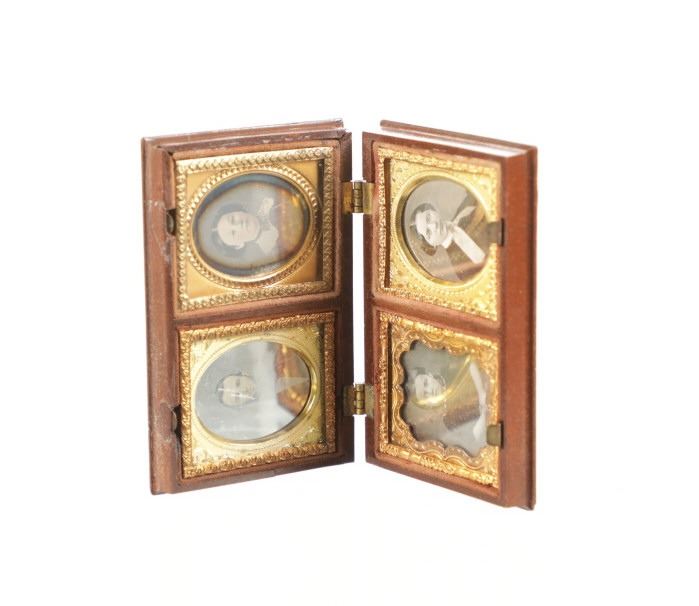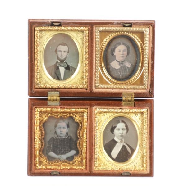 Featured in this lot is this original case housing four small daguerreotype portrait photos of various people circa 1860-1880s. The case shows a wood construction with intricate floral designs on the front and back of the case. The inside shows the four photos with the top two showing a middle aged man with a beard and bow tie, and the other, a middle aged woman. The bottom row shows a young girl to the left and a young woman on the right wearing a lace tie. The photos are set in gold colored frames. The case and photos show good condition overall with some slight wear from their age and use over the years but no signs of obvious damage is preset. The case measures 2 1/8" L x 3 3/8" W x 3/4" D and weighs 120.1 grams.
