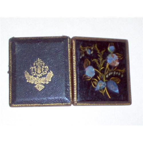 Daguerretype itself is worthless. The case is nicely decorated with embossed leather and pearl inlays with floral motif. Case is in overall nice condition, with a red velvet lining on the interior of the front cover.