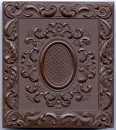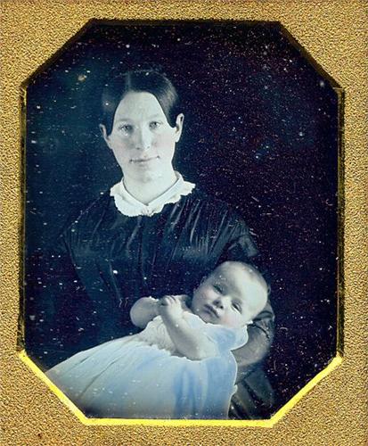 Both appear content. It's interesting to compare this with a modern mother and child photograph, Lot 200. 1/6 plate daguerreotype in early seals, in stippled octagonal mat. The plate is tight in a super example of the geometric case Berg 3-103. Some spots and haze on the underside of the glass. Plate [3+], case [4]