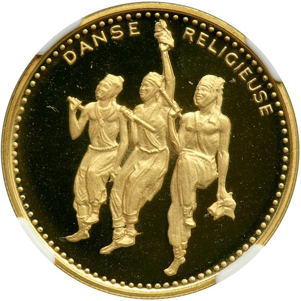 Dahomey. 2500 Francs, 1971. Fr-4; KM-6. Weight 0.2569 ounce. Tenth Anniversary of Independence. Dancers. Only gold issue from Dahomey. Mintage 960 pieces. NGC graded Proof 68 Ultra Cameo.