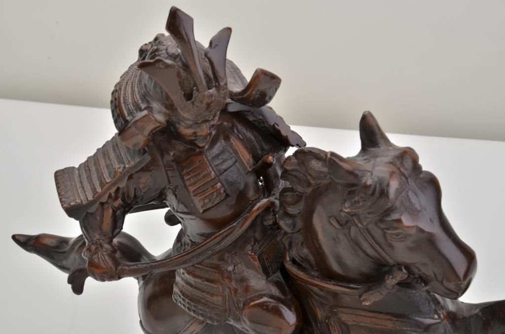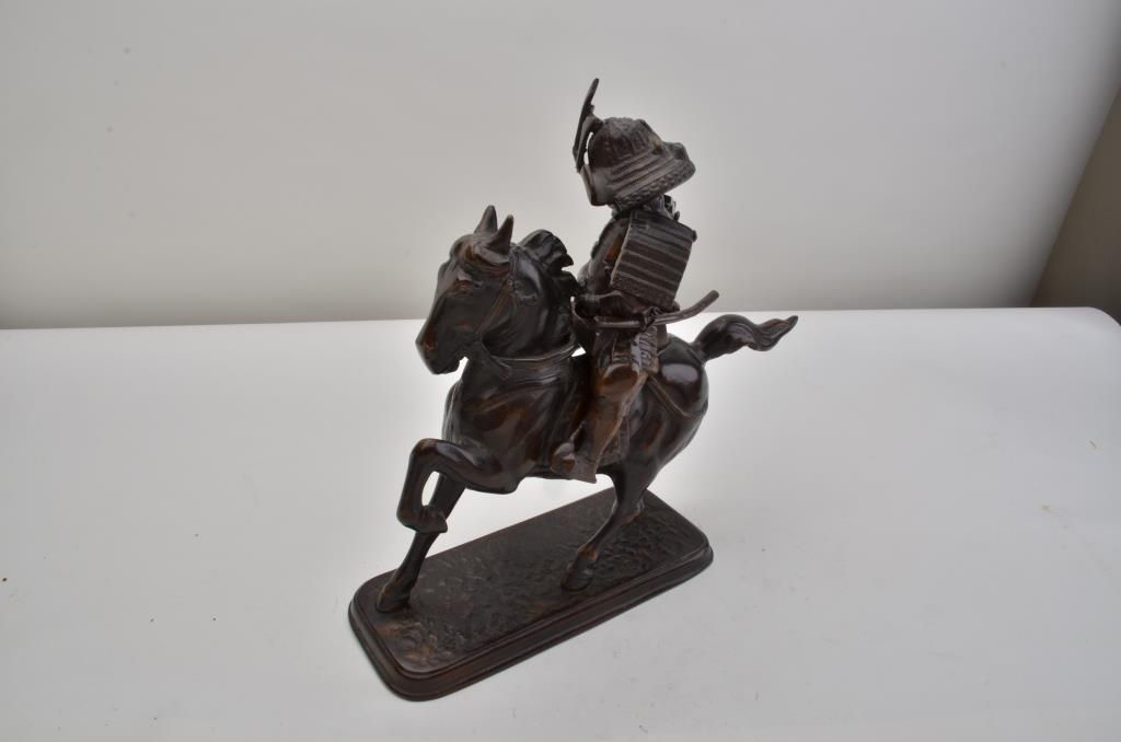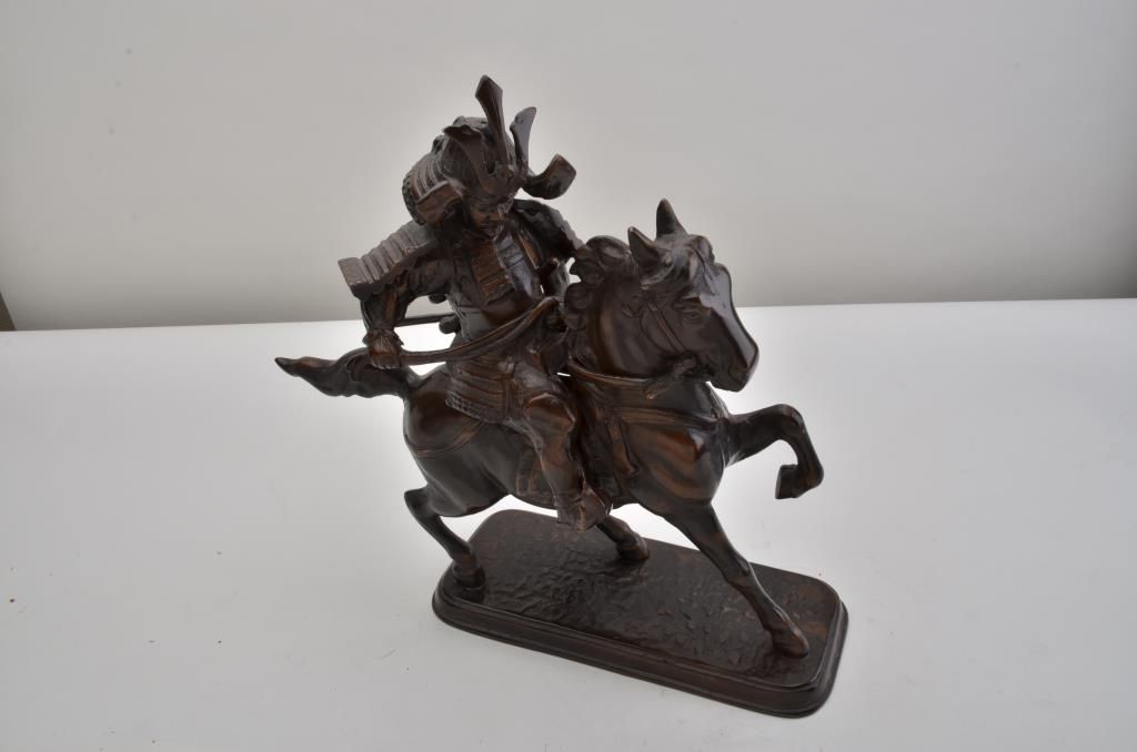 “Dainanko” Bushi Warrior bronze Japanese warrior on horse approx. 13” in height, 14” long and 5-1/2” wide, nicely detailed and in our opinion, approx. 60-100 years old. Est.: $250-$500.