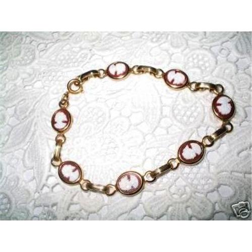 This is so darling.  I am quite certain this is gold filled but can find no markings on the bracelet to confirm this.  Nine small oval cameos white on tan background, with the cameo portrait facing left.  The interlocking links are finely etched for pretty added detail.  The closure is a fold over snap close.  Total length is 7-1/2" inches - a very, beautiful vintage piece and in perfect condition.