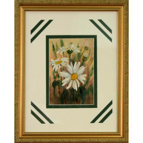 ?Daisies in Bloom? is an absolutely brilliant interpretation of a daisy floral arrangement. This original watercolor painting, done by the highly skilled Helen MacGregor, is an amazing example of what a fluid hand can create. The medium is used with a moderate amount of water to create a soft and hazy effect in the background as the different hues melt together. The colors are certainly inviting as is the subject. The daisies stand out boldly in the foreground, highlighted with a blue-gray tint for shadows and depth. This is a wonderful example of the medium used so effectively that you are absolutely captivated by its subtleties and natural beauty, which are even further enhanced by the specialty cuts used on the top mat. Unique and hand crafted, these angular cuts allow the viewer to see the lush green mat under the rich off-white top mat, both colors which are reflected in the painting. The frame that encloses this enchanting painting is an ornate gold wood frame that is decorated with a floral pattern that reflects the subject matter of the painting most effectively. The charming piece?s dimensions are 16 ¾? x 20 ¾?, which includes the exquisite frame as well. In addition, the painting has been signed by MacGregor. A beautiful piece that is absolutely lovely in every way, and remarkably priced for a painting of this quality.