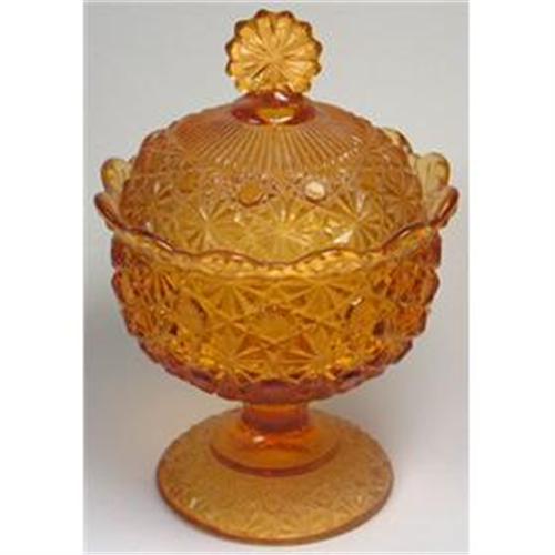 <tr><td>Title:Daisy & Button Pressed Amber Glass Candy Jar</td></tr>