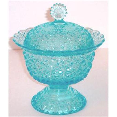 <tr><td>Title:Daisy & Button Pressed Blue Glass Candy Jar</td></tr>