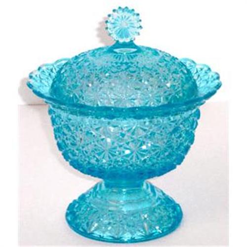 <tr><td>Title:Daisy & Button Pressed Blue Glass Candy Jar</td></tr>
