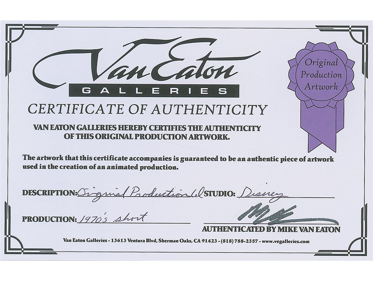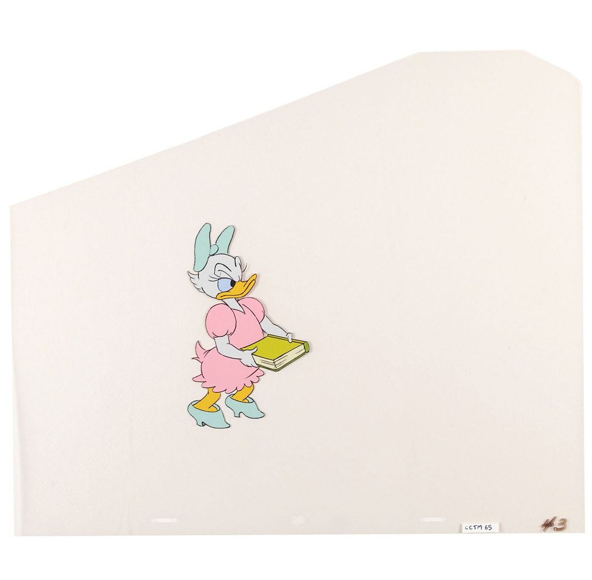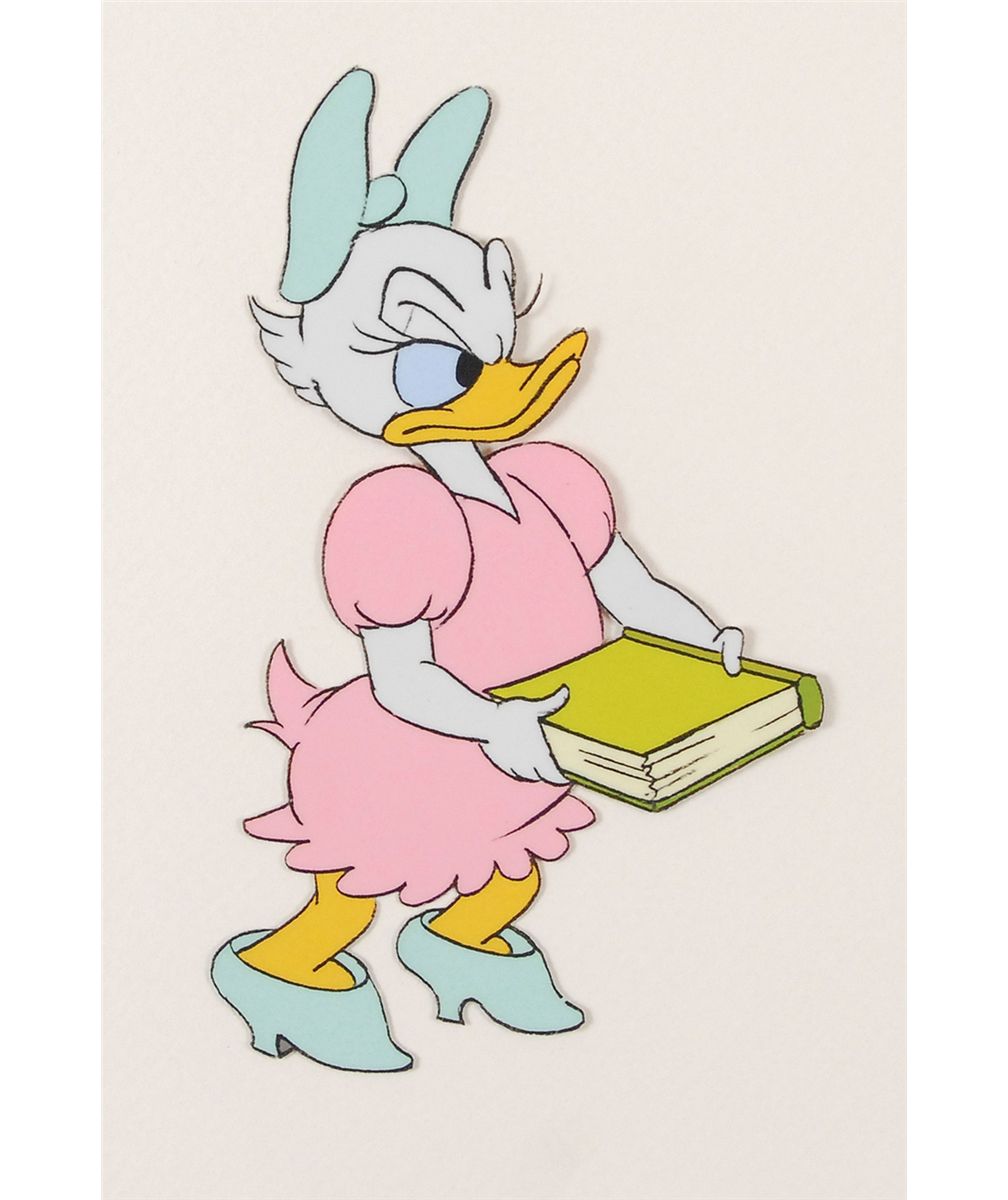 (Walt Disney Studios, 1950s) Original production cel featuring Daisy Duck from a TV cartoon, showing her holding a book with an angry look on her face. The cel measures the full 15 x 12.5 at largest but with irregularly trimmed upper corners. In fine condition. Daisy is very scarce character to find in Disney production art.