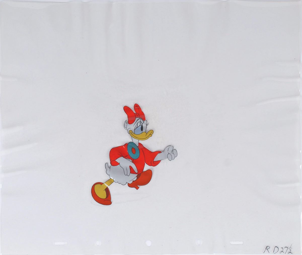 (Walt Disney Studios, circa 1940s) Scarce original production cel featuring Daisy Duck, wearing matching heels, coat, and bow. Image measures 3.25 x 3.75. Light overall rippling, otherwise fine condition.
