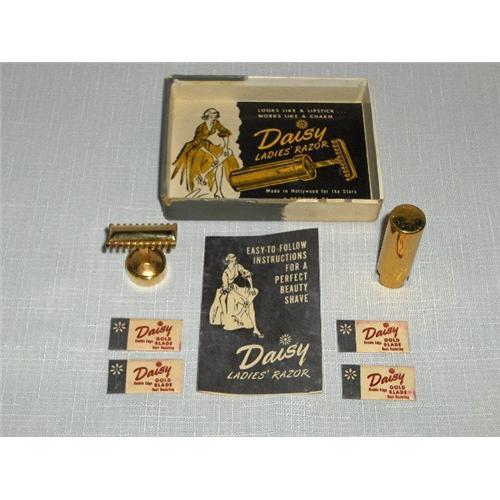 Here is a Daisy Ladies Razor made by the Hollywood Razor Corp. Hollywood 46, California. The slogan states "Looks like a Lipstick, Works like a Charm". Made in Hollywood for the Stars. It is a two part razor. Looks like a lipstick tube when closed. When opened, the two pieces go together. The set comes with 5 new, unused goldtone double edge blades, two piece razor and instructions all enclosed in the original box. The photos look like there is some pitting on the razor, there is NOT any pitting. Condition is excellent. The box has a few rough spots on the edges. Overall, this is a great piece and would be a great addition to any shaving collection. See photos. Take a look at my other items. Thank you for viewing.