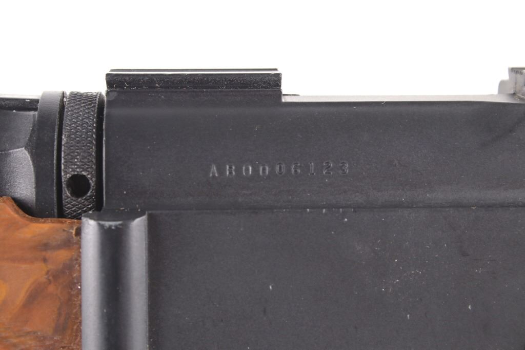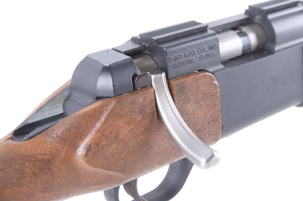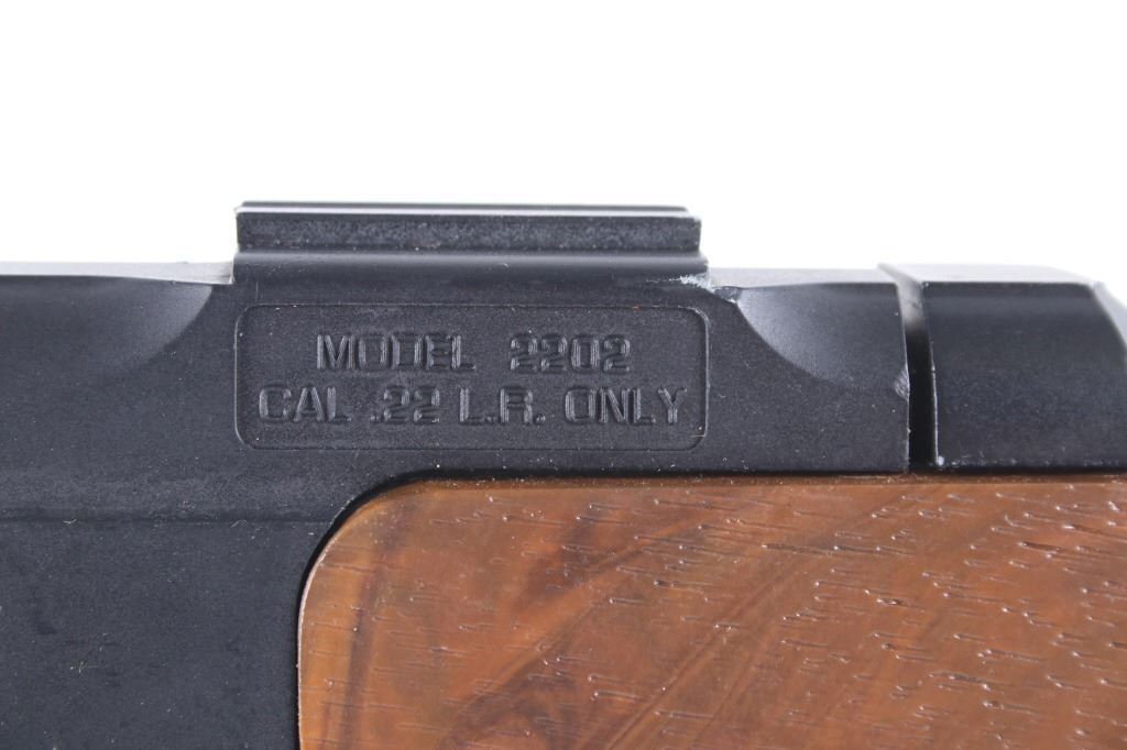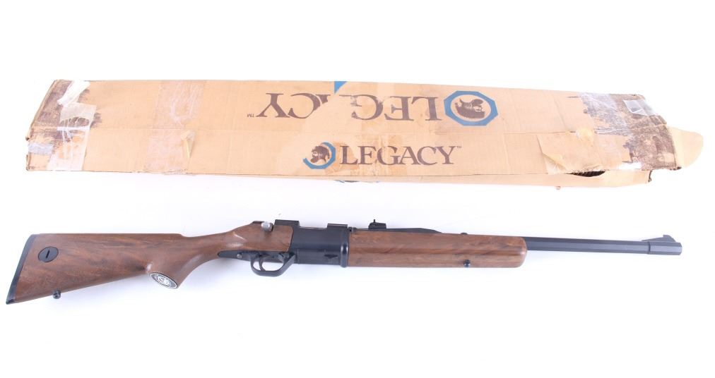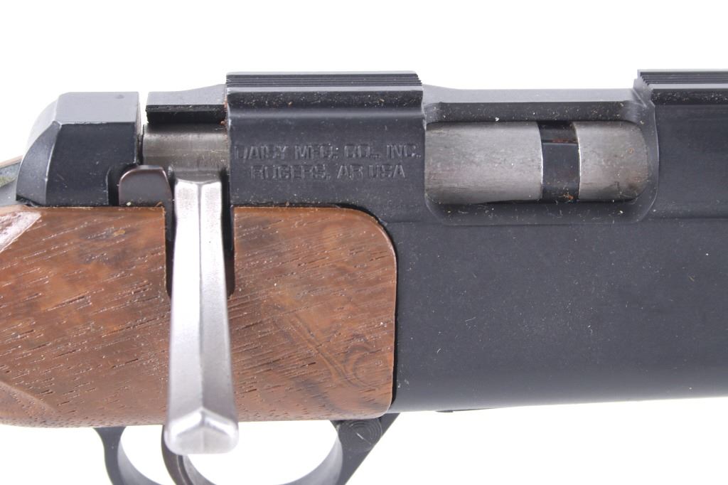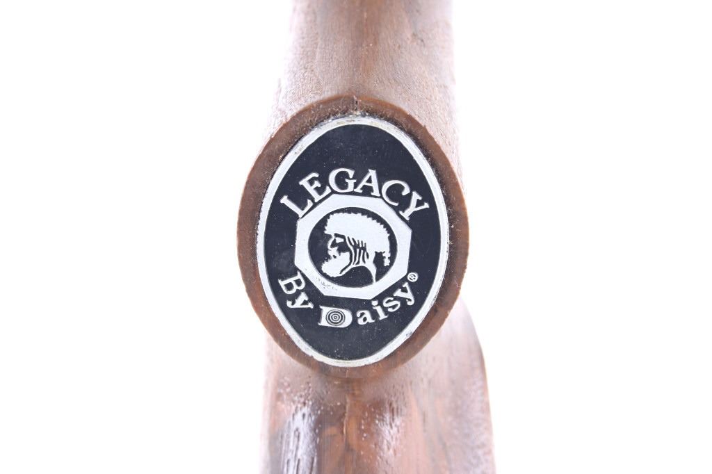 Featured in this lot we have a Daisy Legacy Model 2202 bolt action rifle chambered in .22 caliber with its original box. The rifle was manufactures by Daisy between 1988 - 1991and are hard to find. The model 2202 was part of a push by Daisy in the 80's and into the early 90's to try to get into true firearms using their quality history of making BB and pelt guns for over 100 years. This rifle displays a The rifle displays a 18" long octagonal barrel, aluminum frame, and synthetic stock and foregrip modeled after wood with a black finish across the metal. The frame of the rifle is marked "Model 2202 CAL .22 L.R. ONLY" on the left side and the right marked "Daisy MFG. Co. Inc. Rogers, AR USA". The top of the barrel is marked "Warning! For Safe Operation, Read Owners Manual Before Using.". The rifle comes with its original box marked "Legacy" with original papers. The rifle shows good condition with a tight action and trigger system with the box showing wear. Serial Number: AB0006123. This is a modern firearm and requires a FFL transfer or NICS background check.
