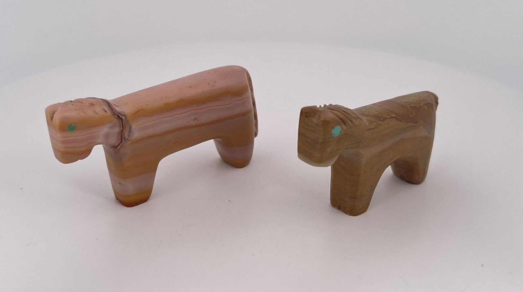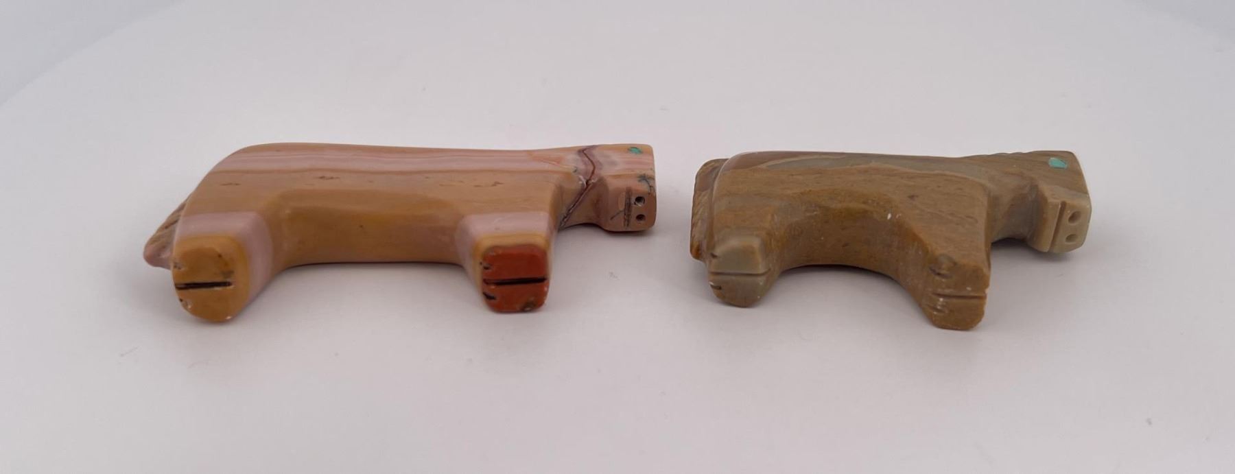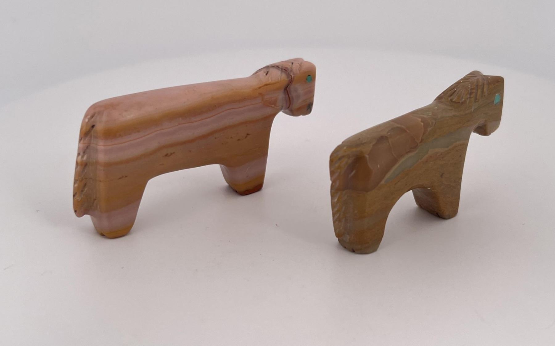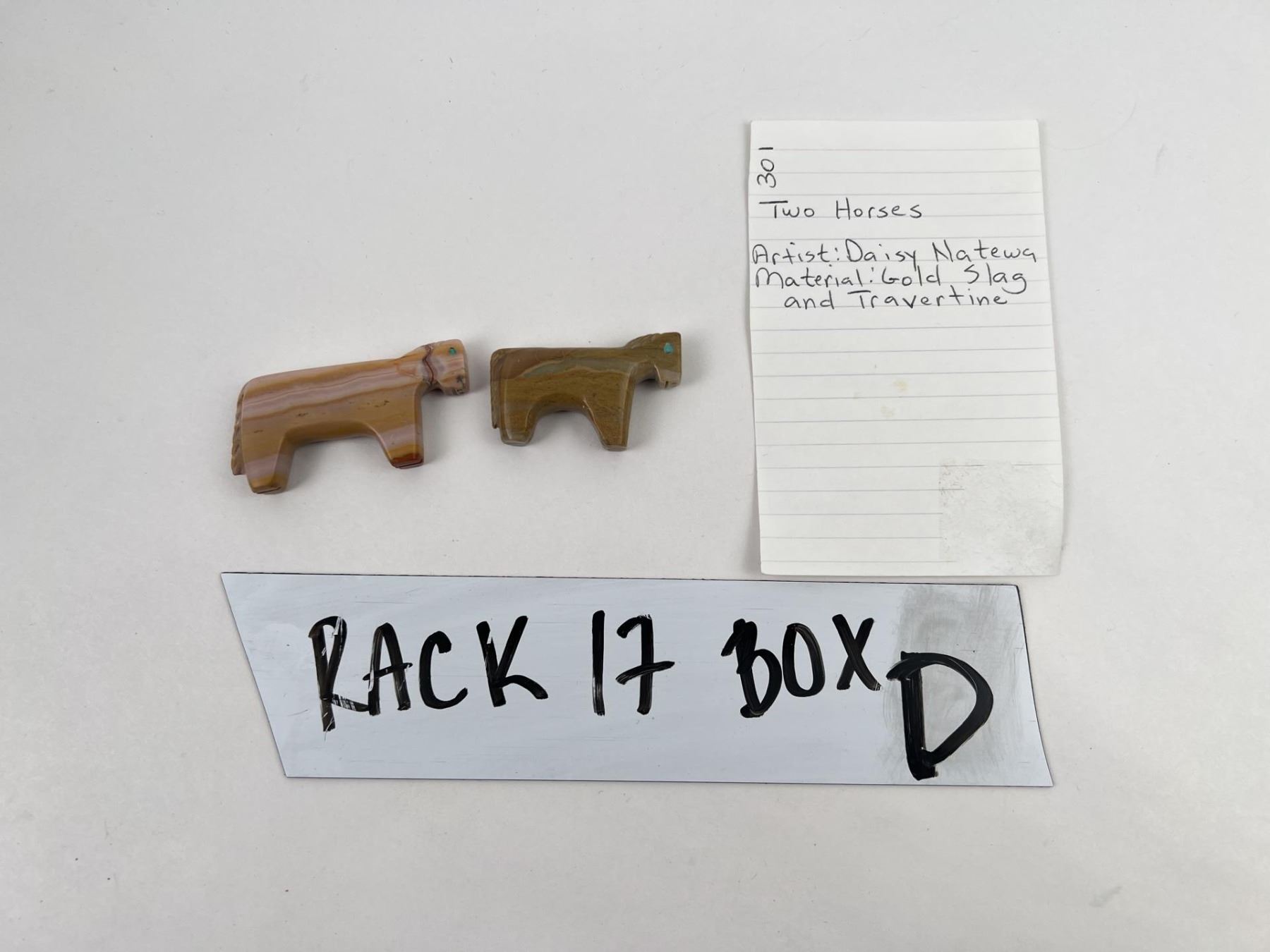 2 1/2" long, 1 1/4" tall, 3/8" wide. One horse has a repaired neck.
