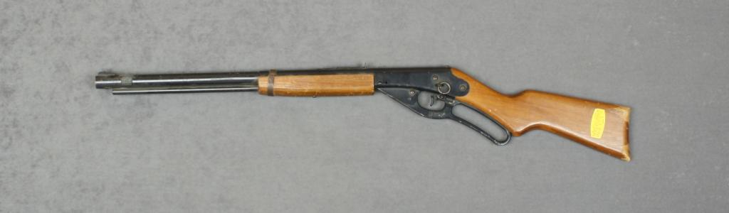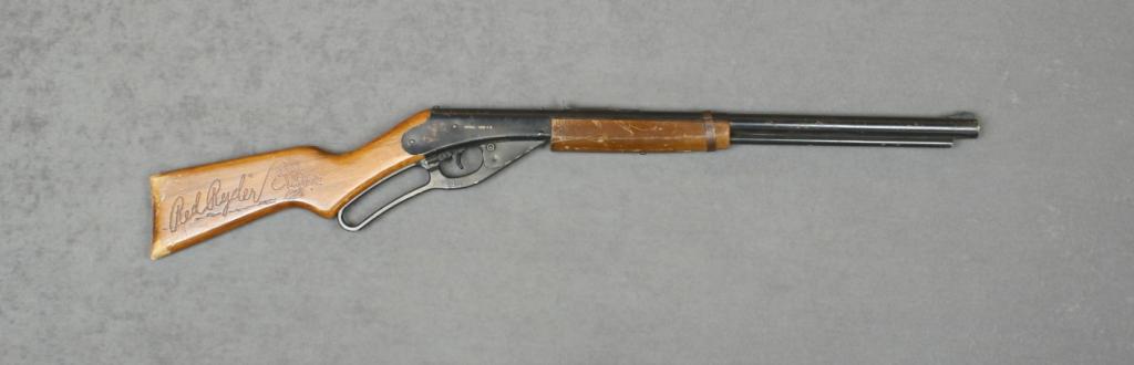 Daisy Red Ryder Model 1938 A-B lever action BB rifle in overall untouched good condition with majority of black paint finish remaining, good wood with some scattered nicks, mars and scratches from years ofstorage. Est.: $75-$150.