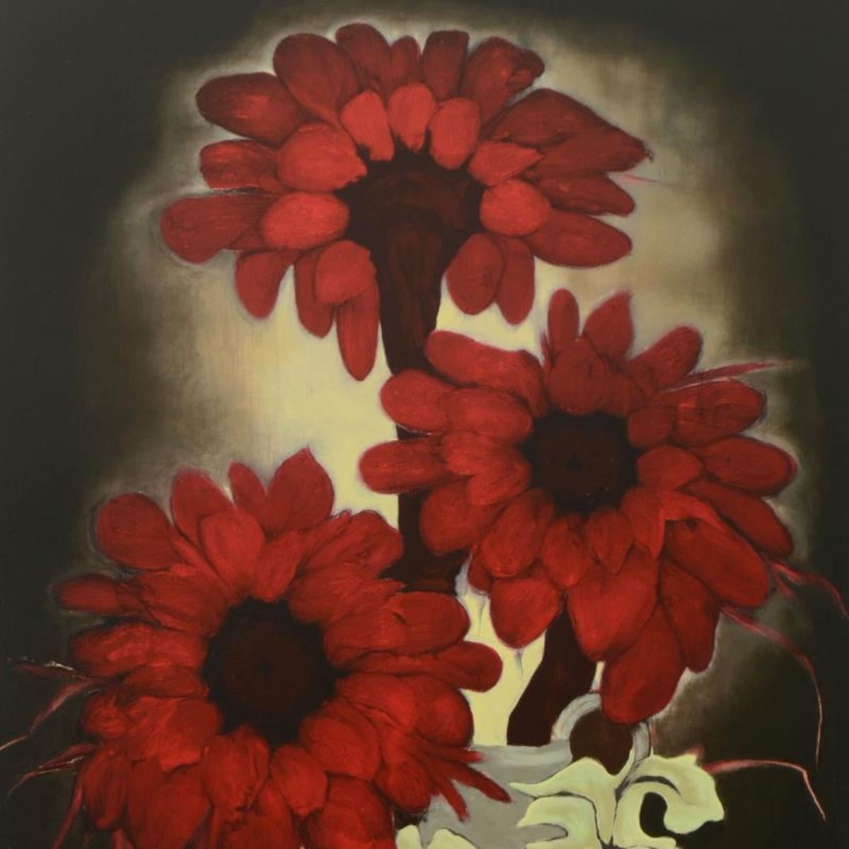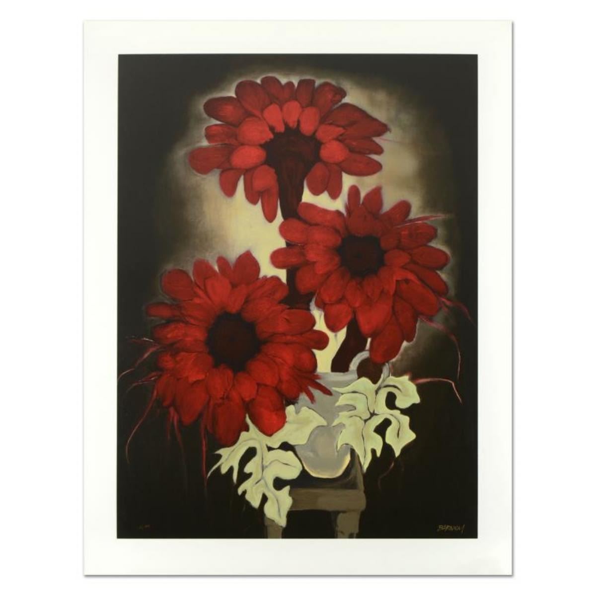 "Daisy Red" is a limited edition serigraph on paper by Brenda Barnum, numbered and hand signed by the artist. Includes Certificate of Authenticity. Measures approx. 36" x 46" (border), 30" x 40" (image).