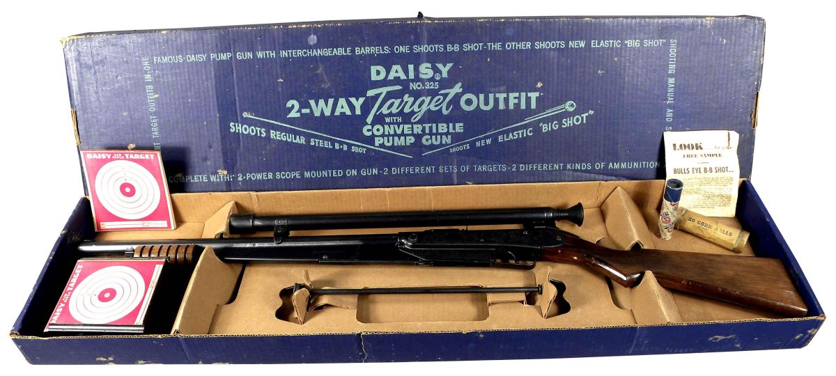 Daisy Two Way Target Outfit B-B Gun in original box, pre 1957. Comes with scope b-b's and target box. Excellent condition.