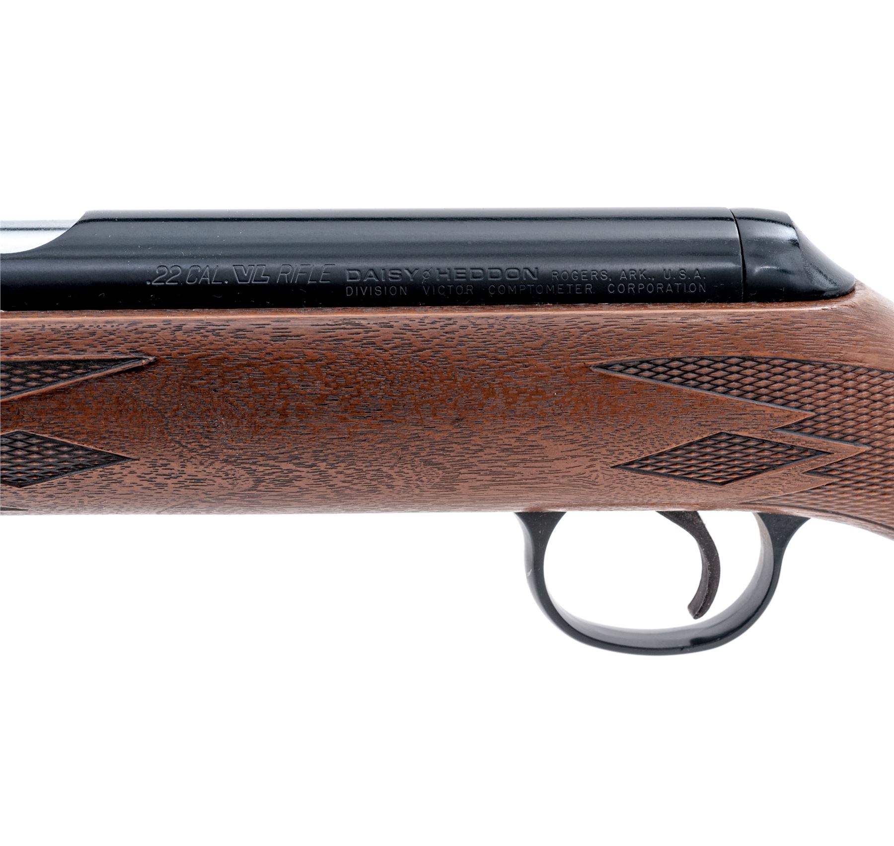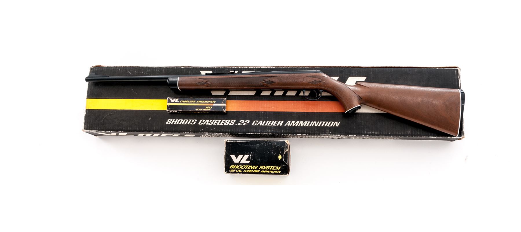 Daisy VL Single Shot Rifle, #A028213, .22 VL cal., 18'' barrel, dark blue/gray finish; pistol-grip plastic simulated wood stock is checkered at the wrist and forend with black plastic ''VL'' buttplate; blade front sight and notched elevator rear sight. Includes an original box and 1000-round brick of .22 VL cartridges. Rifle is in near new overall condition. Receiver with a few small handling marks, approx. 99% original finish remains. Stock is excellent with a few minor marks to the right side near the buttplate spacer. Good action, mirror bright bore. Box shows fairly heavy wear. Brick of ammo shows storage type wear to the exterior; few of the boxes were opened and the cartridges look good. Est.: $350-$550. (C&R)