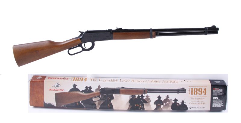 Modeled after the Winchester Model 1894. Lever pump action in .177 caliber, wood stock, and open sights. Includes original box. Condition: Good to very good.