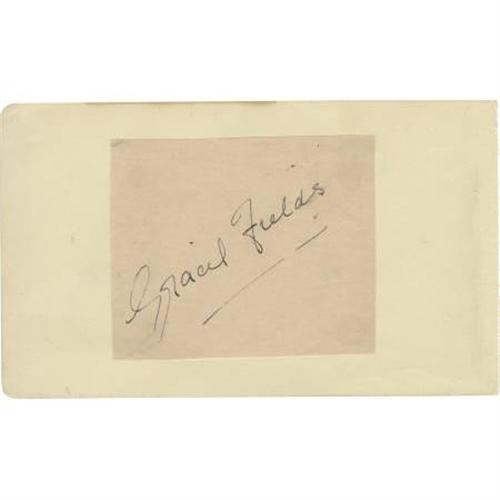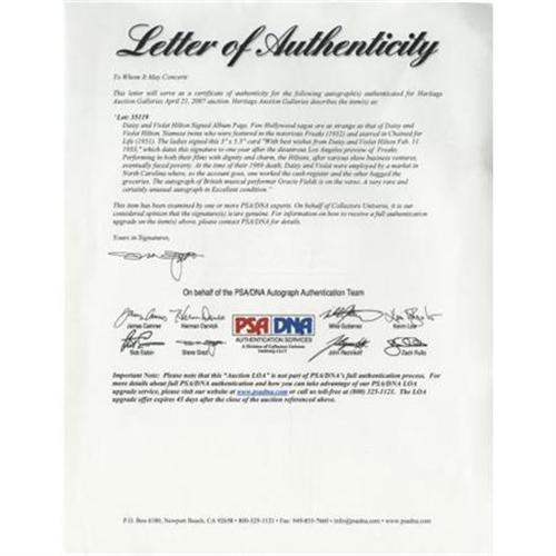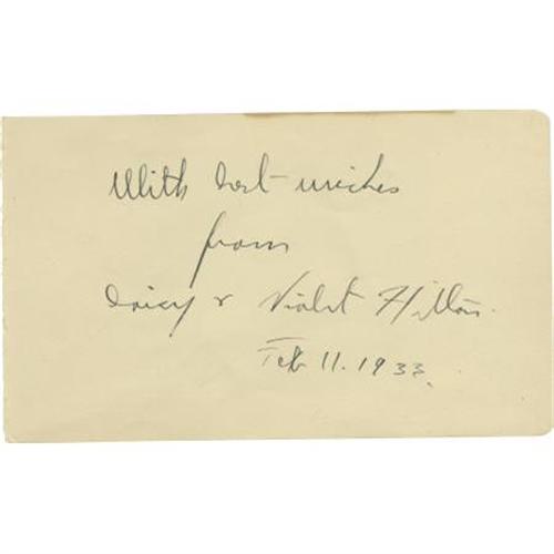 <B>Daisy and Violet Hilton Signed Album Page.</B></I> Few Hollywood sagas are as strange as that of Daisy and Violet Hilton, Siamese twins who were featured in the notorious <I>Freaks</B></I> (1932) and starred in <I>Chained for Life</B></I> (1951). The ladies signed this 3" x 5.5" card "With best wishes from Daisy and Violet Hilton Feb. 11. 1933," which dates this signature to one year after the disastrous Los Angeles preview of <I>Freaks.</B></I> Performing in both their films with dignity and charm, the Hiltons, after various show business ventures, eventually faced poverty. At the time of their 1969 death, Daisy and Violet were employed by a market in North Carolina where, so the account goes, one worked the cash register and the other bagged the groceries. The autograph of British musical performer Gracie Fields is en verso. A very rare and certainly unusual autograph in Excellent condition. <I>Accompanied by LOA from PSA/DNA</B></I>.<BR><BR><b>Shipping:</b> Requires 3rd Party Shipping (<a target="_blank" href="http://www.heritageauctions.com/common/shipping.php">view shipping information</a>)