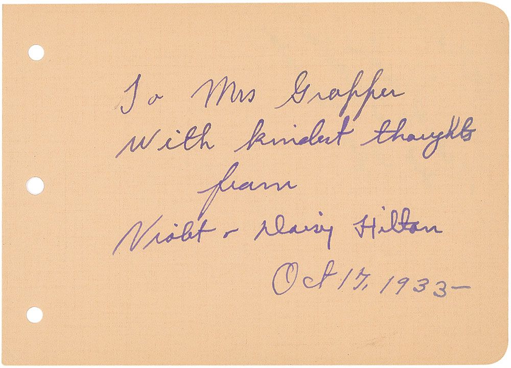 Conjoined twins (1908–1969) who toured vaudeville and appeared in the 1932 film Freaks. They died from the Hong Kong Flu in 1969. Vintage fountain pen signature and inscription, “To Mrs. Graffer, with kindest thoughts from Vilolet & Daisy Hilton, Oct 17, 1933,” on an off-white 6 x 4.5 album page. In fine condition.