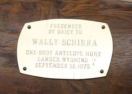 Daisy model 880 .177 caliber pellet rifle, with aftermarket William sights, presentation plaque which reads “Presented by Daisy to Wally Shirra, one-shot antelope hunt, Lander Wyoming, 1975. Very good used condition,minor rust. With certificate of authenticity from Little John’s Antique Arms as consigned directly from the estate of American Hero and legendary astronaut Wally Schirra. See Bio. Est: $250 - $500
