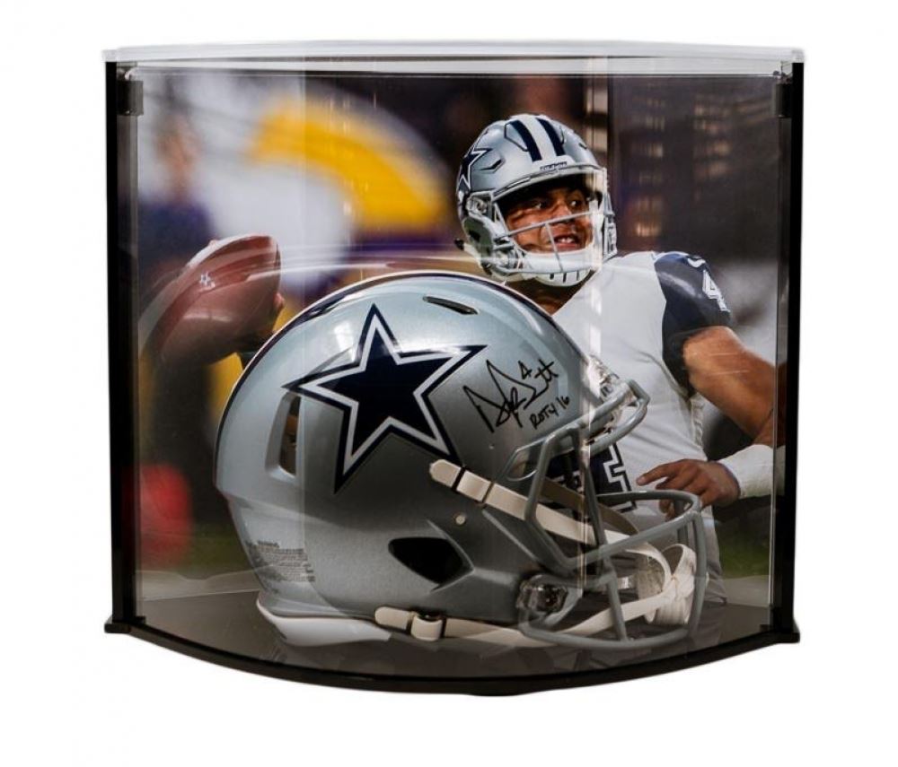 Dallas Cowboys Full-Size Authentic Pro-Line Speed Helmet. The helmet has been hand-signed and inscribed in black felt-tip pen by Dak Prescott. The helmet is limited edition and has been hand-numbered out of 104.