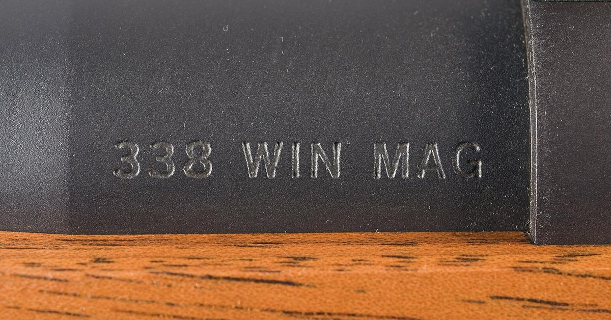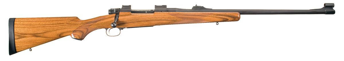 This rifle features a hooded ramp front and fixed ramp rear sights and scope bases mounted on the receiver. Standard markings, hinged floor plate and mounted with a nicely figured one piece checkered walnut stock with a plastic grip cap, black rubber Dakota Arms recoil pad and sling swivel studs.