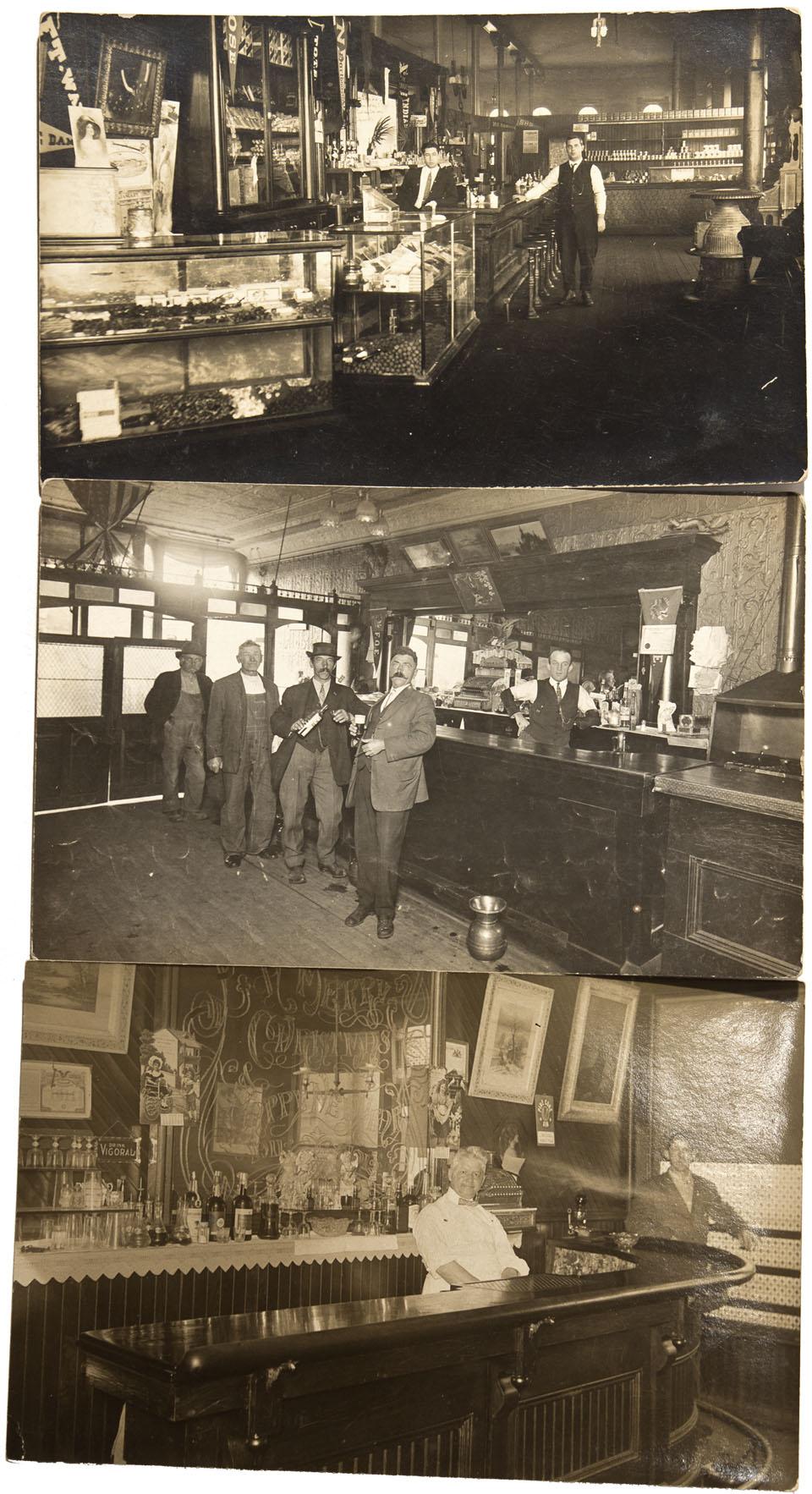 Lot of 3. 1) Black and white RCP, no border. Four men stand on the outside of the bar, two holding alcohol in their hands, and one bartender on the opposite side. Appears to be a wood front bar. Fairly small, only a few bottles and glasses are seen. A detailed textured back wall, bag of salt, banners, framed photographs and a furnace are all visible. Used, divided back, cancelled; however, the postage stamp has been removed. Good. 2) Black and white RPC, no border. One bartender behind a beautiful curved wood front bar and another man standing in the corner. An engraved mirror behind the bar, "Merry Christmas Happy New Year 1911, 1912". Framed photos, Victorian lady calendars, a sign of "Drink Vigoral" and another of "Pine Cone Gym". Pitchers, whiskey bottles, and glasses lined up. Unused, divide back. Dark brown "paste" which stained the reverse, otherwise good. 3) Unlike a usual saloon. Two young men stand near the wood front bar. Various banners are hung around the saloon, "N Dakota, and Indiana". A furnace and piano, or organ are near the back. Glass showcases filled with items that cannot be depicted. Appears to be cans, and boxes of food on the back shelves and a January 1915 calendar. Unused, divided. "from Waveland, Ind." has been written on the reverse in print writing, is a possibility.