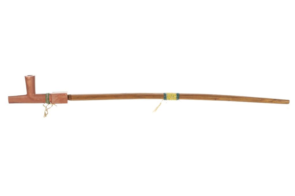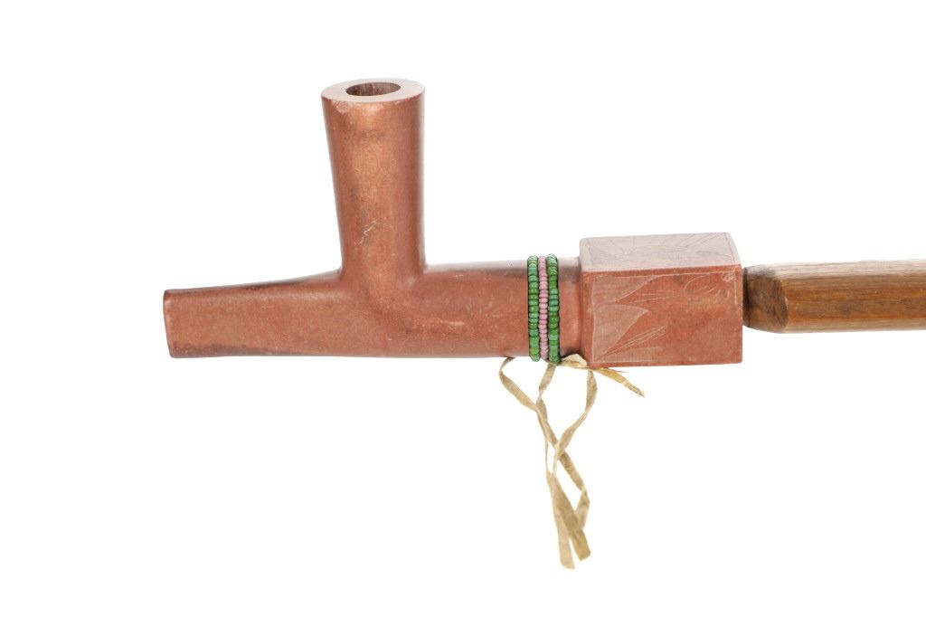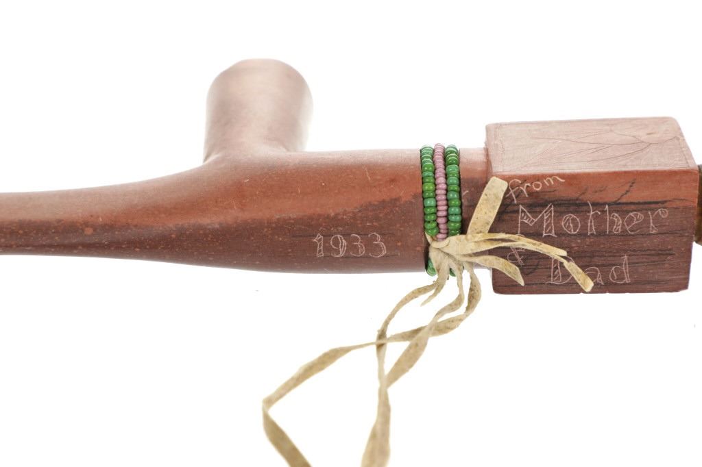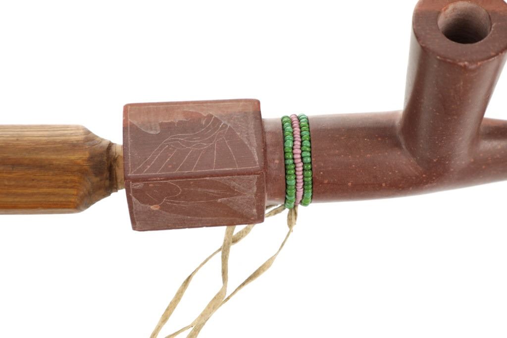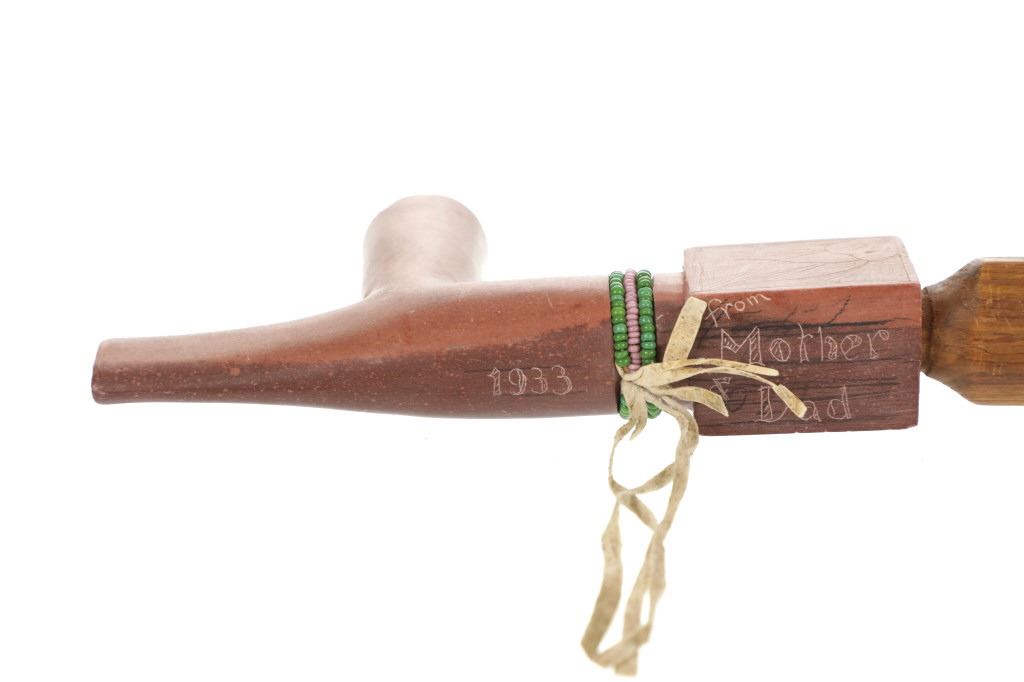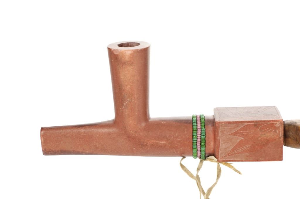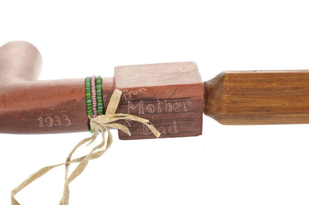 This is an excellent circa 1933 catalinite pipe and beaded wood stem from the Dakota Sioux Native American Indians. The pipe bowl is hand carved in a traditional “T” pattern with hand etchings of a Chief and leaves. The pipe bowl is signed on the bottom, “1933 from Mother & Dad”. The pipe shows a fin-like blade blunt point end tapering to the tall cylindrical bowl, which tapers out. Behind the bowl is an incised section that holds an Indian tanned buckskin gasket with trade cotton thread sewn early glass trade seed beads in three rows, displaying colors of greasy green and Cheyenne pink and a bottom with Indian tanned buckskin hide fringe. The bowl has a rich red to speckled pink coloring in pipestone catalinite. The stem is carved of solid wood with a slight tapering bend having a scrapped and slight file burned finish. An incised section at the center holds a trade canvas muslin wrap with trade-cotton-thread-sewn early glass trade seed beads in colors of greasy yellow, semi-transparent, faceted semi-transparent green, and some various crazy colors, as well as two small fringes of Indian tanned buckskin hide at the base. Provenance: From a private museum collection in the Auvergne-Rhone-Alpes region of France. Overall, the pipe and bowl together measure 27.25” L. The bowl is 6.75” L by 2 7/8” H by 1.25” W.
