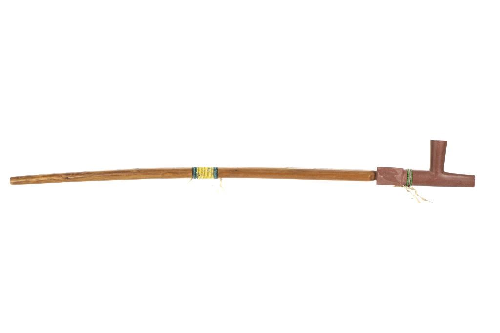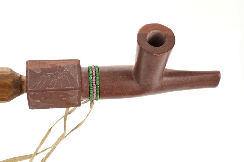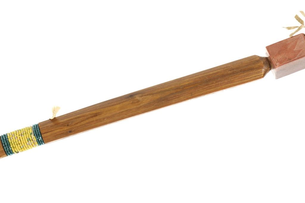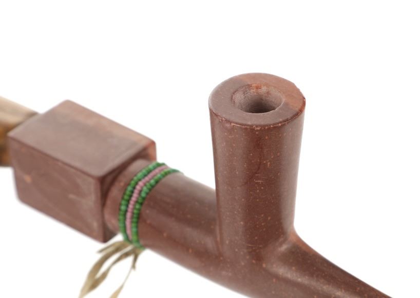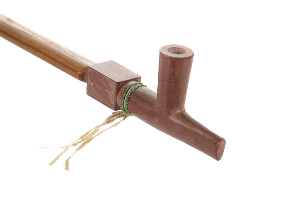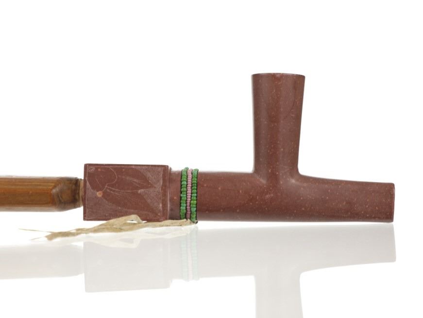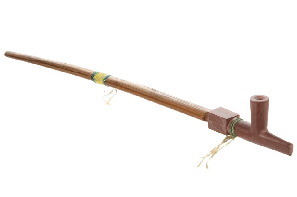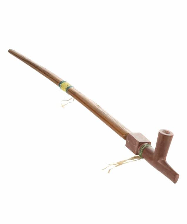 This is an excellent circa 1933 catalinite pipe and beaded wood stem from the Dakota Sioux Native American Indians. The pipe bowl is hand carved in a traditional “T” pattern with hand etchings of a Chief and leaves. The pipe bowl is signed on the bottom, “1933 from Mother & Dad”. The pipe shows a fin-like blade blunt point end tapering to the tall cylindrical bowl, which tapers out. Behind the bowl is an incised section that holds an Indian tanned buckskin gasket with trade cotton thread sewn early glass trade seed beads in three rows, displaying colors of greasy green and Cheyenne pink and a bottom with Indian tanned buckskin hide fringe. The bowl has a rich red to speckled pink coloring in pipestone catalinite. The stem is carved of solid wood with a slight tapering bend having a scrapped and slight file burned finish. An incised section at the center holds a trade canvas muslin wrap with trade-cotton-thread-sewn early glass trade seed beads in colors of greasy yellow, semi-transparent, faceted semi-transparent green, and some various crazy colors, as well as two small fringes of Indian tanned buckskin hide at the base. Provenance: From a private museum collection in the Auvergne-Rhone-Alpes region of France. Overall, the pipe and bowl together measure 27.25” L. The bowl is 6.75” L by 2 7/8” H by 1.25” W.