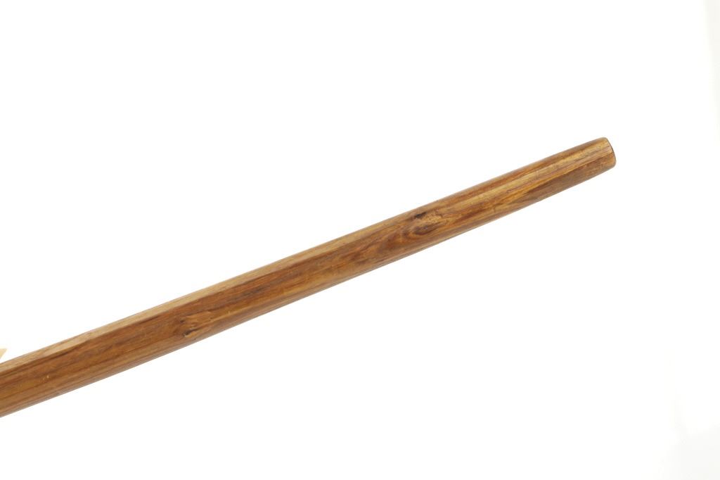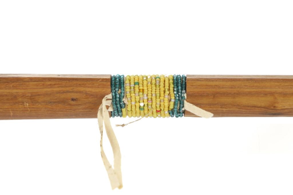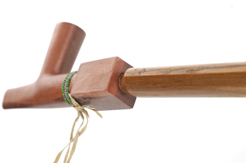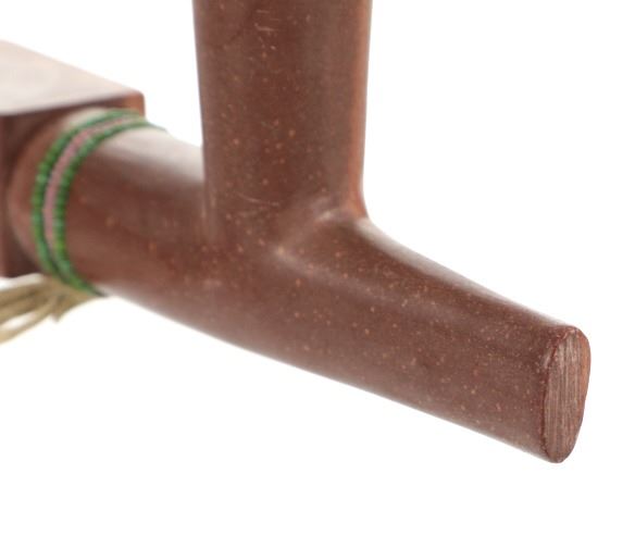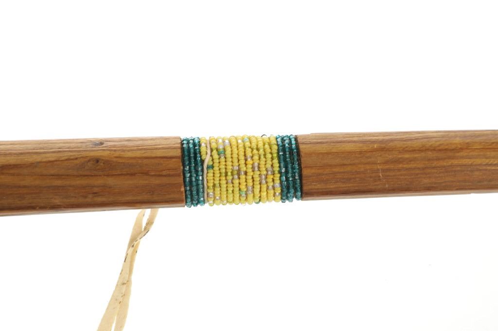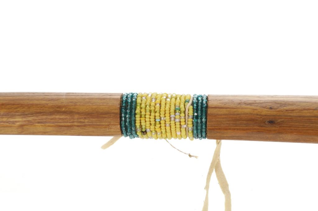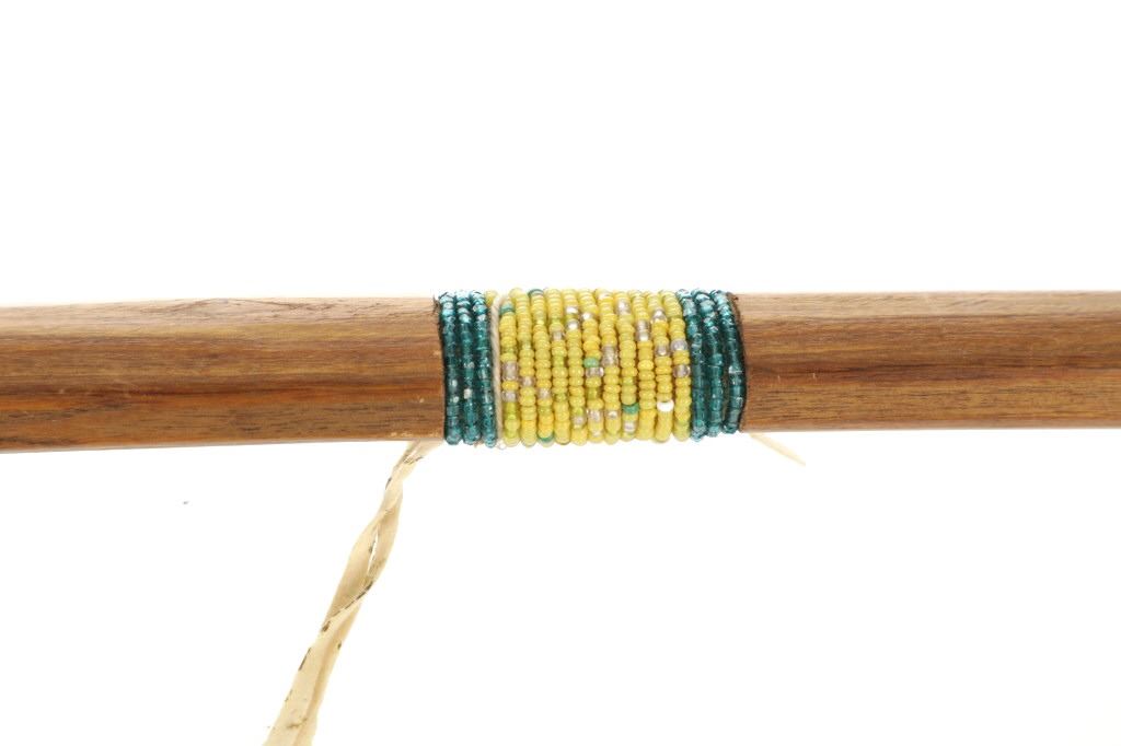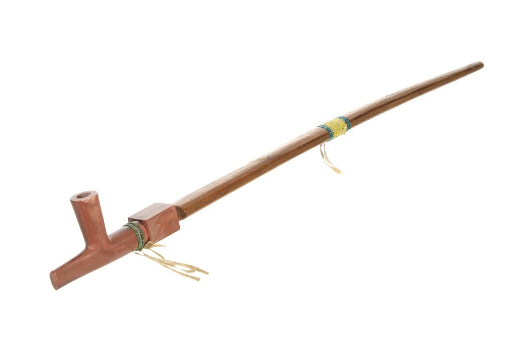 This is an excellent circa 1933 catalinite pipe and beaded wood stem from the Dakota Sioux Native American Indians. The pipe bowl is hand carved in a traditional “T” pattern with hand etchings of a Chief and leaves. The pipe bowl is signed on the bottom, “1933 from Mother & Dad”. The pipe shows a fin-like blade blunt point end tapering to the tall cylindrical bowl, which tapers out. Behind the bowl is an incised section that holds an Indian tanned buckskin gasket with trade cotton thread sewn early glass trade seed beads in three rows, displaying colors of greasy green and Cheyenne pink and a bottom with Indian tanned buckskin hide fringe. The bowl has a rich red to speckled pink coloring in pipestone catalinite. The stem is carved of solid wood with a slight tapering bend having a scrapped and slight file burned finish. An incised section at the center holds a trade canvas muslin wrap with trade-cotton-thread-sewn early glass trade seed beads in colors of greasy yellow, semi-transparent, faceted semi-transparent green, and some various crazy colors, as well as two small fringes of Indian tanned buckskin hide at the base. Provenance: From a private museum collection in the Auvergne-Rhone-Alpes region of France. Overall, the pipe and bowl together measure 27.25” L. The bowl is 6.75” L by 2 7/8” H by 1.25” W.