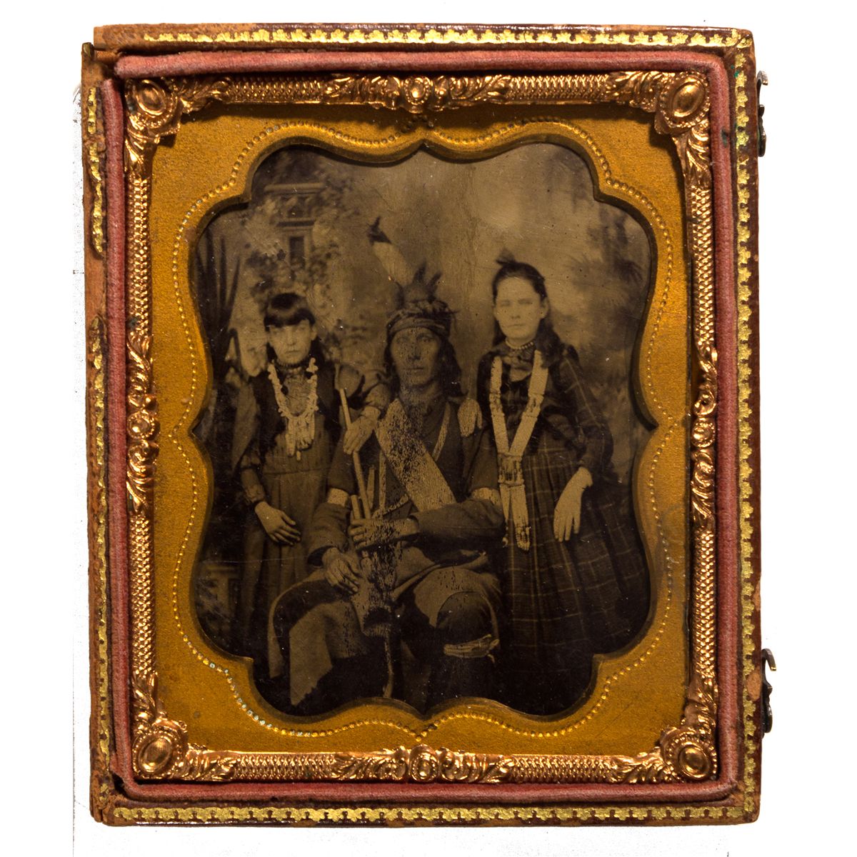 Photograph measures 2.25” x 2.75” and 3” x 3.5” in holder. Dark to medium contrast and focus is sharp, but blurred in some spots. There is some wear on the photograph and the holder. The holder was once connected to another, but has since been detached. The photograph shows a man, possibly Sioux, with two young girls. Photographer is unknown, therefore the official tribal identify of the man remains unknown. Based on the man’s attire in comparison with other Native photographs, it’s possible he was Yankton or Santee Sioux. The girls are dressed in Euro American clothing, but wear Native beadwork around their necks. [http://beinecke.library.yale.edu/dl_crosscollex/SetsSearchExecXC.asp?srchtype=ITEM].