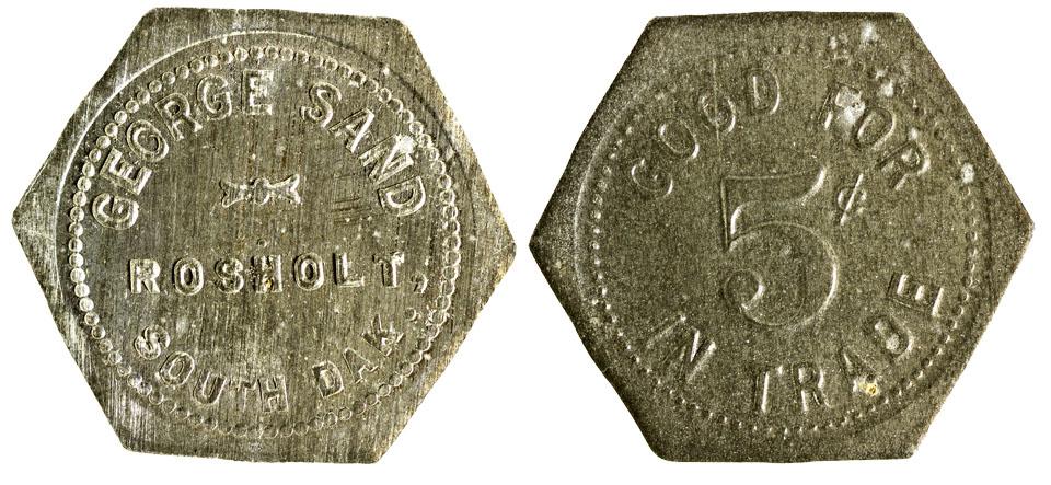 Obverse: George Sand / Rosholt / South Dak.; reverse: Good For / 5c / In Trade. Octagonal, 22mm, aluminum.