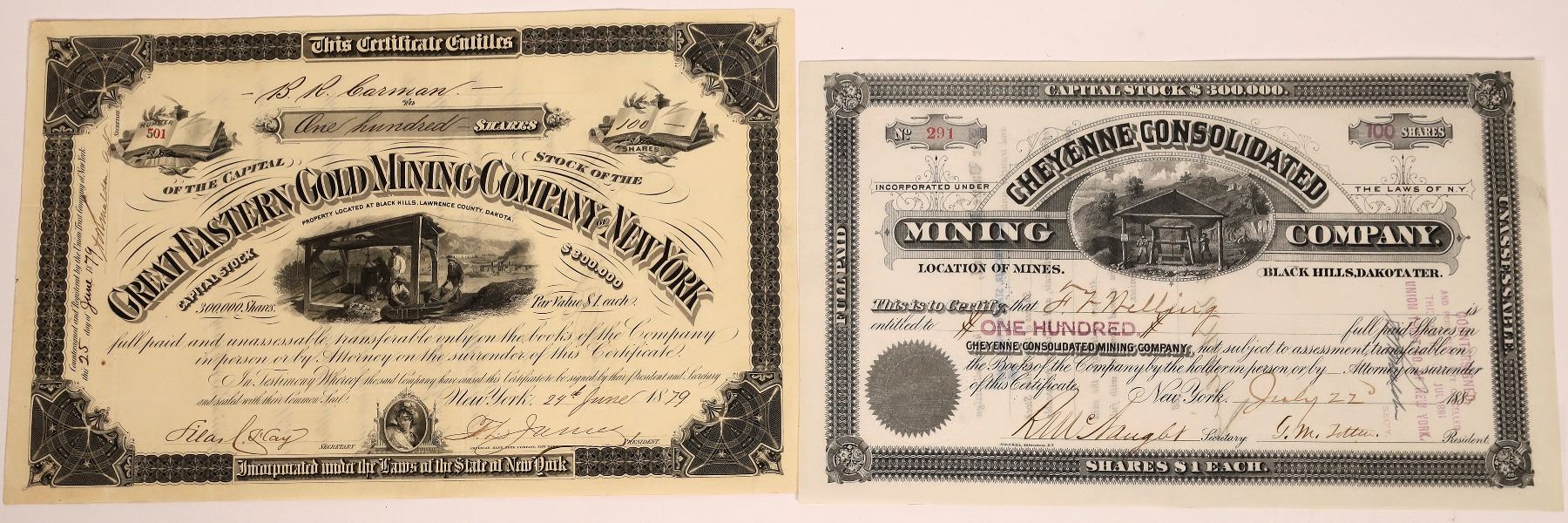 Lot includes: Cheyenne Cons. Mining Company, 1881. Issued at New York. Location of Mines: Black Hills, Dakota Territory. Also, Great Eastern Gold Mining Company, New York, issued in 1879. Property located at Black Hills, Lawrence County, Dakota printed on the certificate. Both have nice mining vignettes. VF. Uncanceled. State:Dakotas City: Date: Provenance: