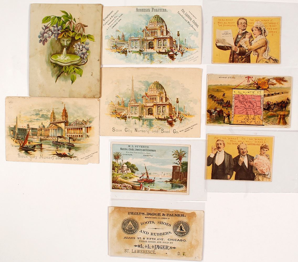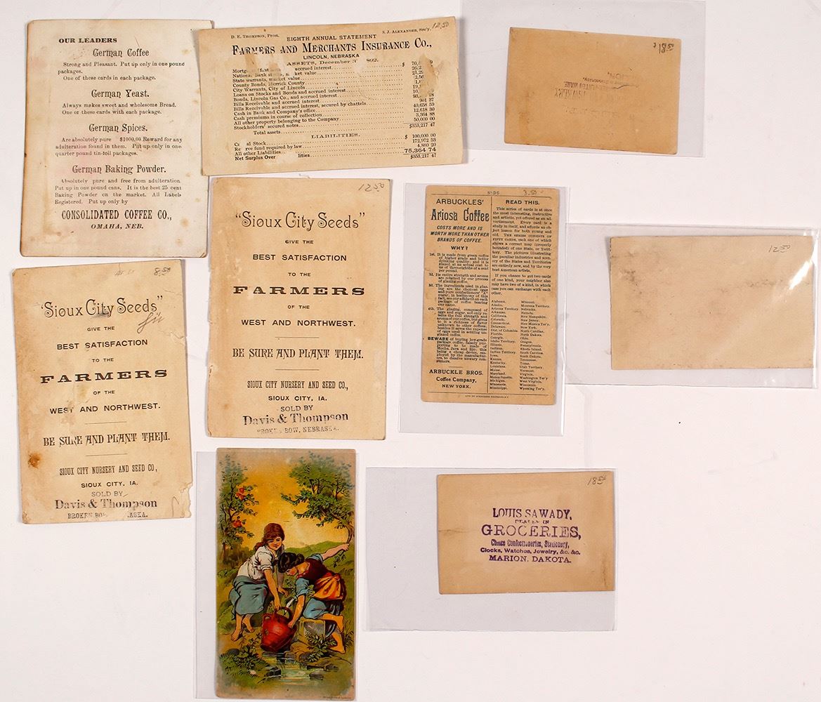 1 Lincoln NE trade card. 8 Dakota Territory trade cards- Broken Bow, Omaha, Marion. Date: c. 1880-1890 Location: Dakota Territory HWAC # 54141