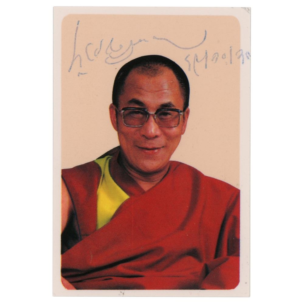 Scarce color glossy 2.25 x 3.25 prayer card with a portrait of the Dalai Lama, who has signed in Tibetan in ballpoint. In very fine condition. Accompanied by the original mailing envelope and a compliments sheet from the "office of His Holiness the Dalai Lama."