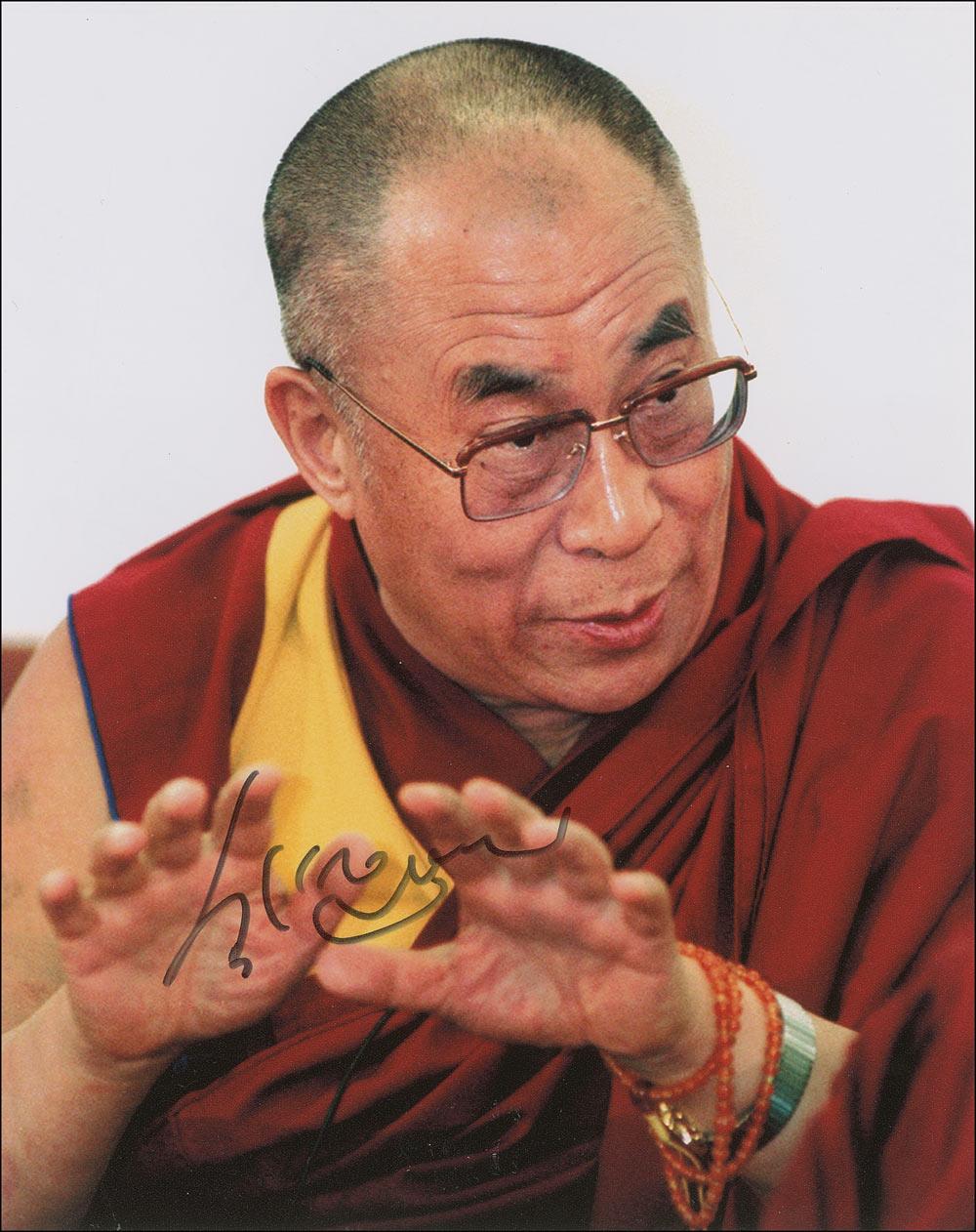Color satin-finish 8 x 10 photo of the Dalai Lama engaged in conversation, signed in black felt tip. In very fine condition.