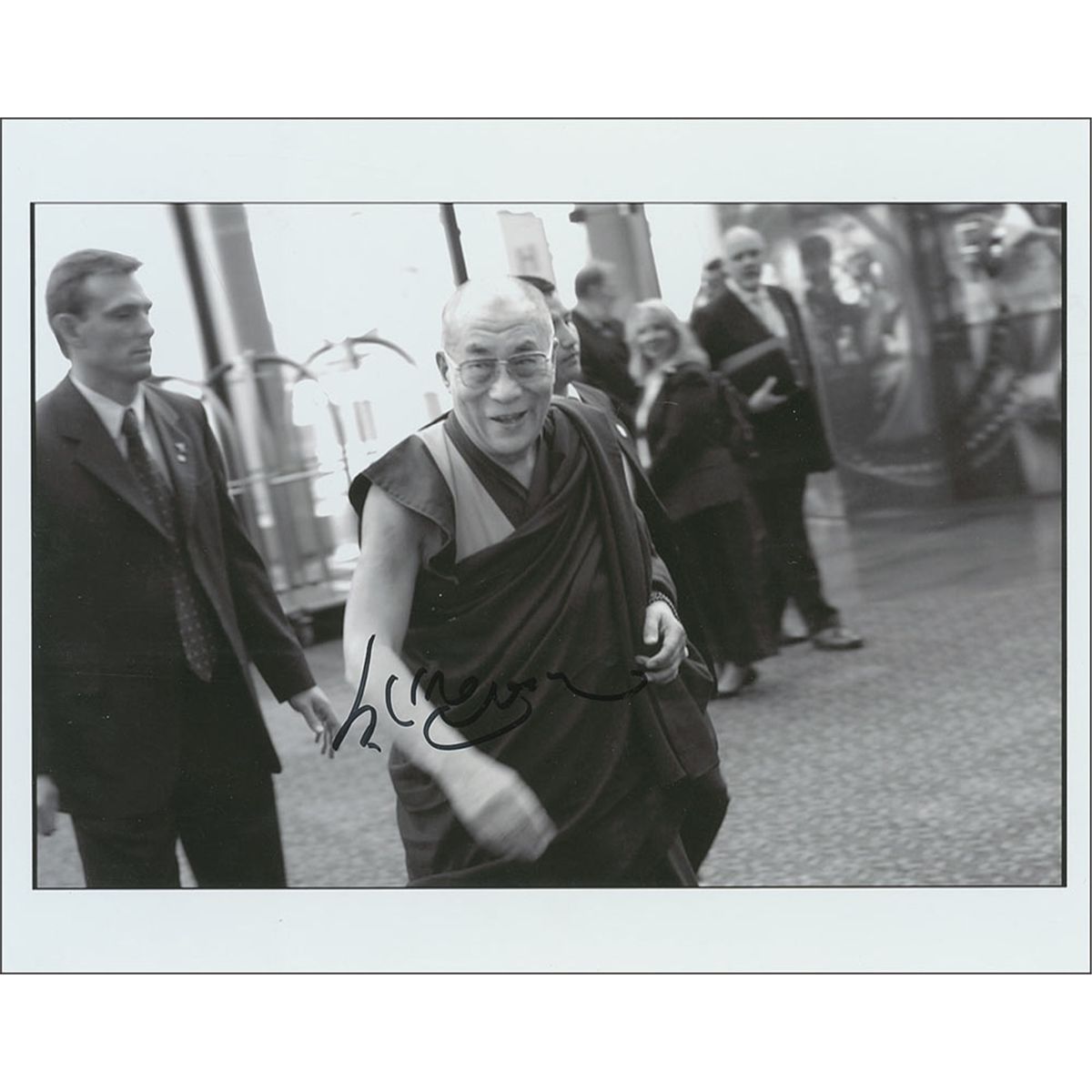 Glossy 10 x 8 casual photo of the Dalai Lama passing through a hotel lobby, signed in black felt tip. In fine condition, with light horizontal bends, a few faint creases, and spots of soiling at the edges.