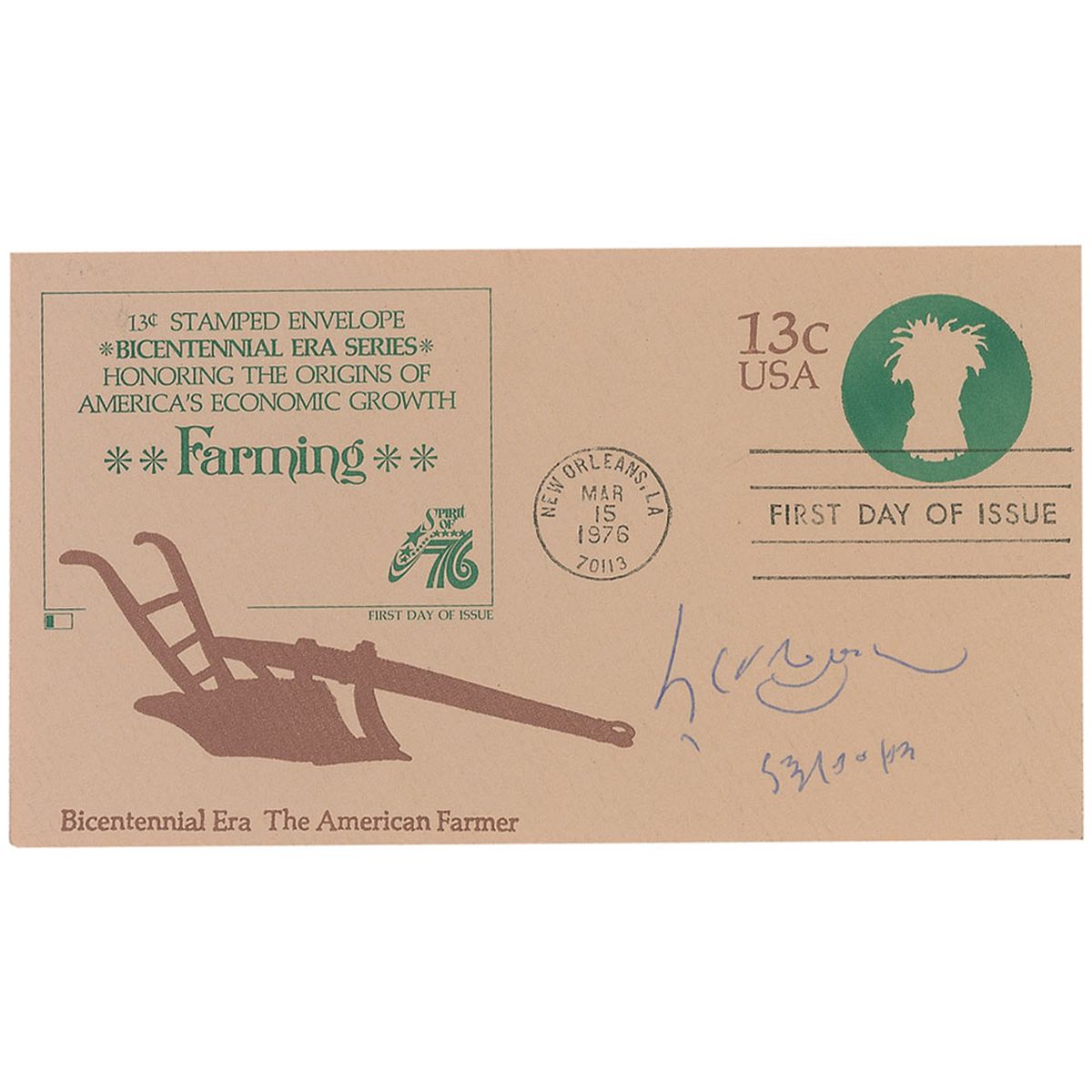 FDC with a cachet honoring the Bicentennial Era of the American Farmer, signed by the spiritual leader in blue ballpoint. In fine condition.